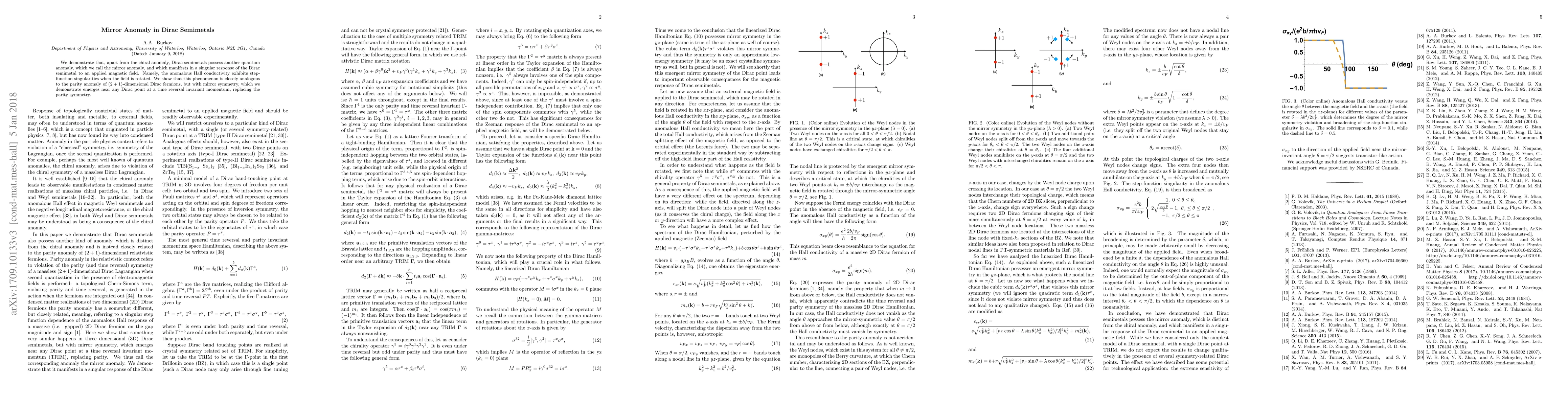 Summary: This study reveals a new quantum anomaly in Dirac semimetals termed the mirror anomaly, characterized by singular step-function changes in anomalous Hall conductivity when rotating the magnetic field, analogous to the parity anomaly in (2+1)-dimensional Dirac fermions but linked to mirror symmetry.