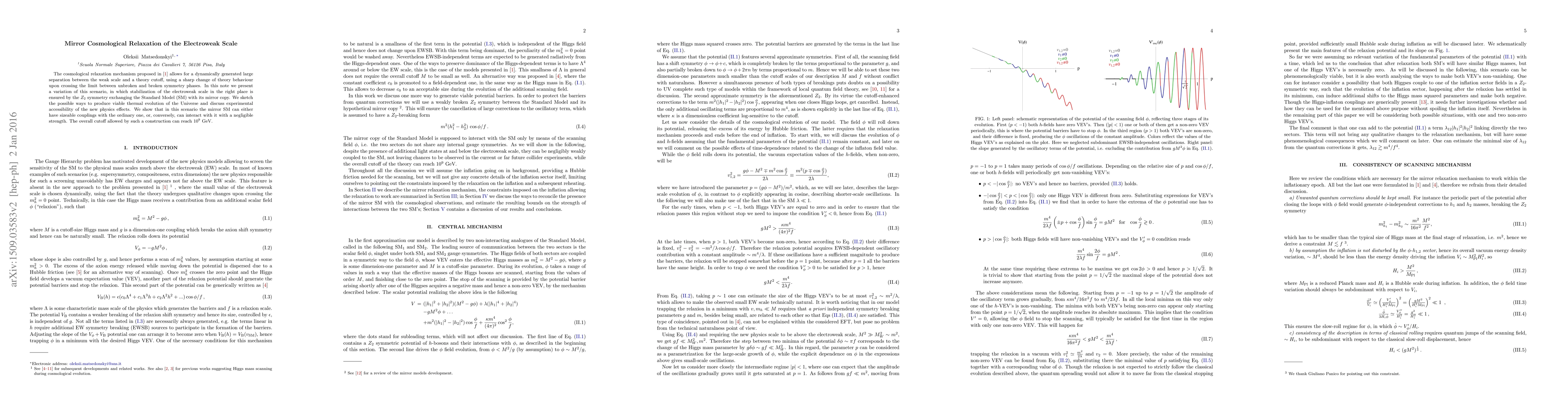 The cosmological relaxation mechanism proposed in [1] allows for a dynamically generated large separation between the weak scale and a theory cutoff, using a sharp change of theory behaviour upon crossing the limit between unbroken and broken symmetry phases. In this note we present a variation of this scenario, in which stabilization of the electroweak scale in the right place is ensured by the $Z_2$ symmetry exchanging the Standard Model (SM) with its mirror copy. We sketch the possible ways to produce viable thermal evolution of the Universe and discuss experimental accessibility of the new physics effects. We show that in this scenario the mirror SM can either have sizeable couplings with the ordinary one, or, conversely, can interact with it with a negligible strength. The overall cutoff allowed by such a construction can reach $10^9$ GeV.