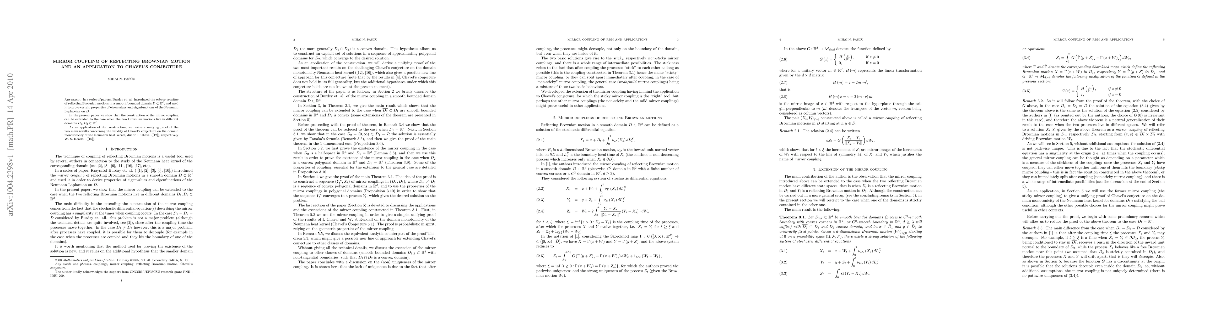 This paper extends the mirror coupling technique for reflecting Brownian motion to cases where the motions occur in different domains, providing a unifying proof for Chavel's conjecture on the domain monotonicity of the Neumann heat kernel. The method offers new insights into the properties of eigenvalues and eigenfunctions of the Neumann Laplaceian.