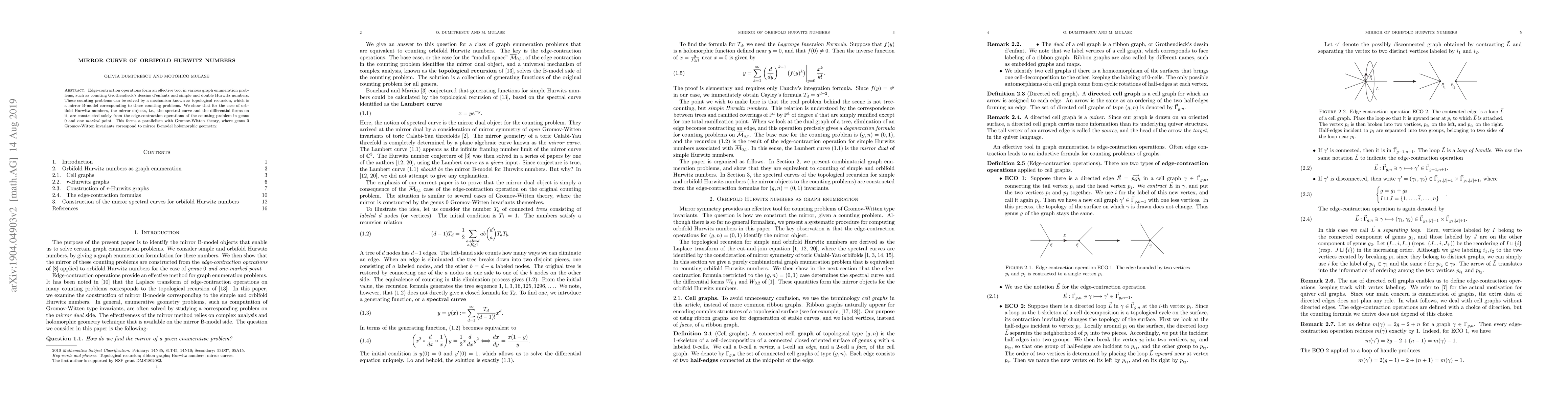Edge-contraction operations form an effective tool in various graph enumeration problems, such as counting Grothendieck's dessins d'enfants and simple and double Hurwitz numbers. These counting problems can be solved by a mechanism known as topological recursion, which is a mirror B-model corresponding to these counting problems. We show that for the case of orbifold Hurwitz numbers, the mirror objects, i.e., the spectral curve and the differential forms on it, are constructed solely from the edge-contraction operations of the counting problem in genus $0$ and one marked point. This forms a parallelism with Gromov-Witten theory, where genus 0 Gromov-Witten invariants correspond to mirror B-model holomorphic geometry.
