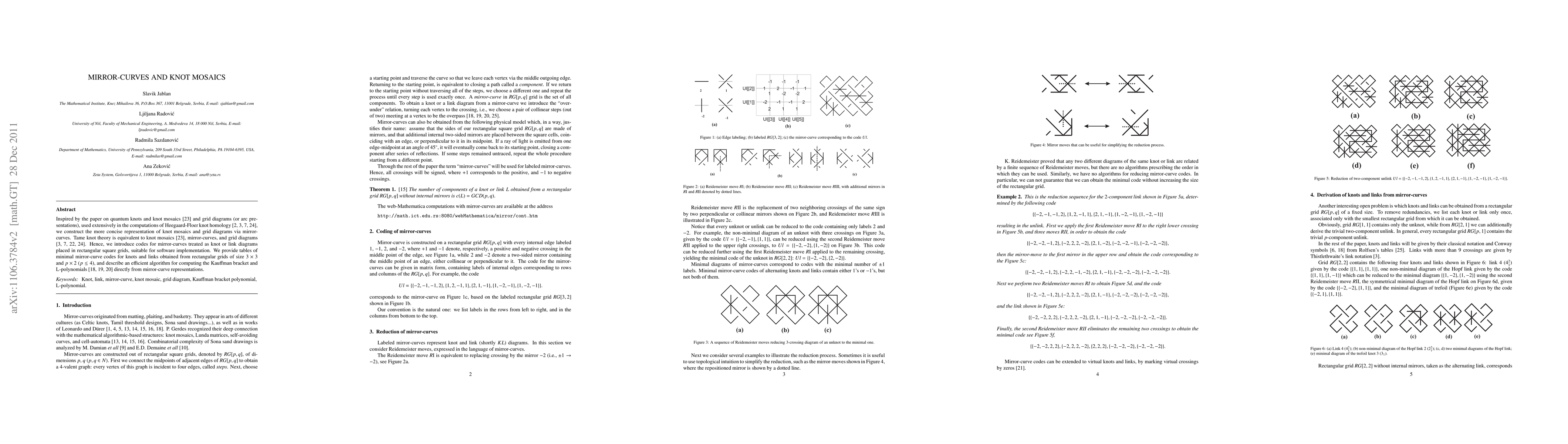 The paper constructs concise representations of knot mosaics and grid diagrams using mirror-curves, showing their equivalence to tame knot theory. It introduces codes for mirror-curves in rectangular grids, providing minimal codes tables and an efficient algorithm for computing Kauffman bracket and L-polynomials.