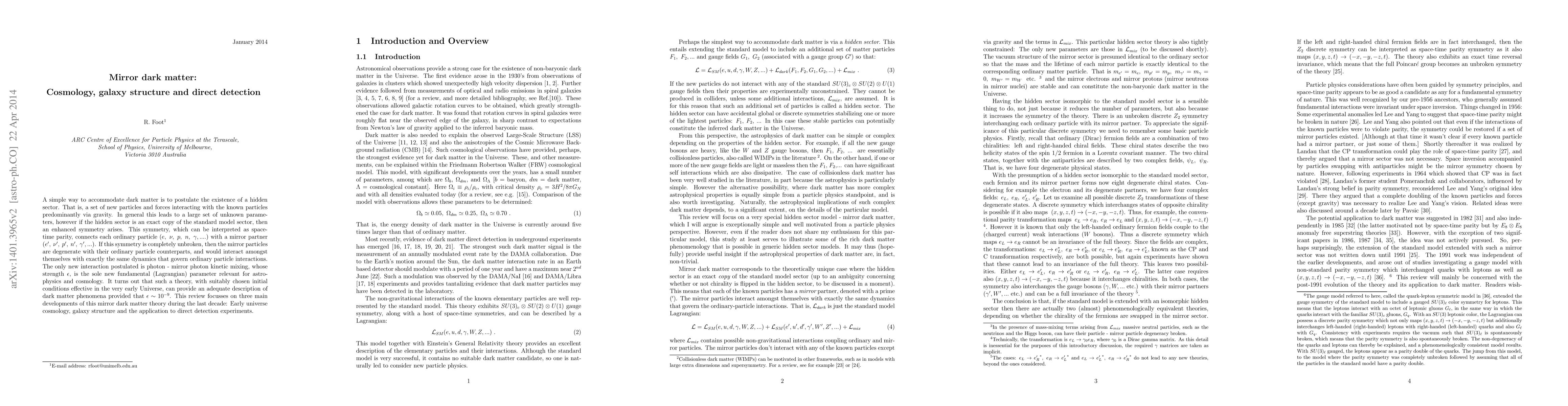 A simple way to accommodate dark matter is to postulate the existence of a hidden sector. That is, a set of new particles and forces interacting with the known particles predominantly via gravity. In general this leads to a large set of unknown parameters, however if the hidden sector is an exact copy of the standard model sector, then an enhanced symmetry arises. This symmetry, which can be interpreted as space-time parity, connects each ordinary particle ($e, \ \nu, \ p, \ n, \ \gamma, ....)$ with a mirror partner ($e', \ \nu', \ p', \ n', \ \gamma', ...)$. If this symmetry is completely unbroken, then the mirror particles are degenerate with their ordinary particle counterparts, and would interact amongst themselves with exactly the same dynamics that govern ordinary particle interactions. The only new interaction postulated is photon - mirror photon kinetic mixing, whose strength $\epsilon$, is the sole new fundamental (Lagrangian) parameter relevant for astrophysics and cosmology. It turns out that such a theory, with suitably chosen initial conditions effective in the very early Universe, can provide an adequate description of dark matter phenomena provided that $\epsilon \sim 10^{-9}$. This review focuses on three main developments of this mirror dark matter theory during the last decade: Early universe cosmology, galaxy structure and the application to direct detection experiments.