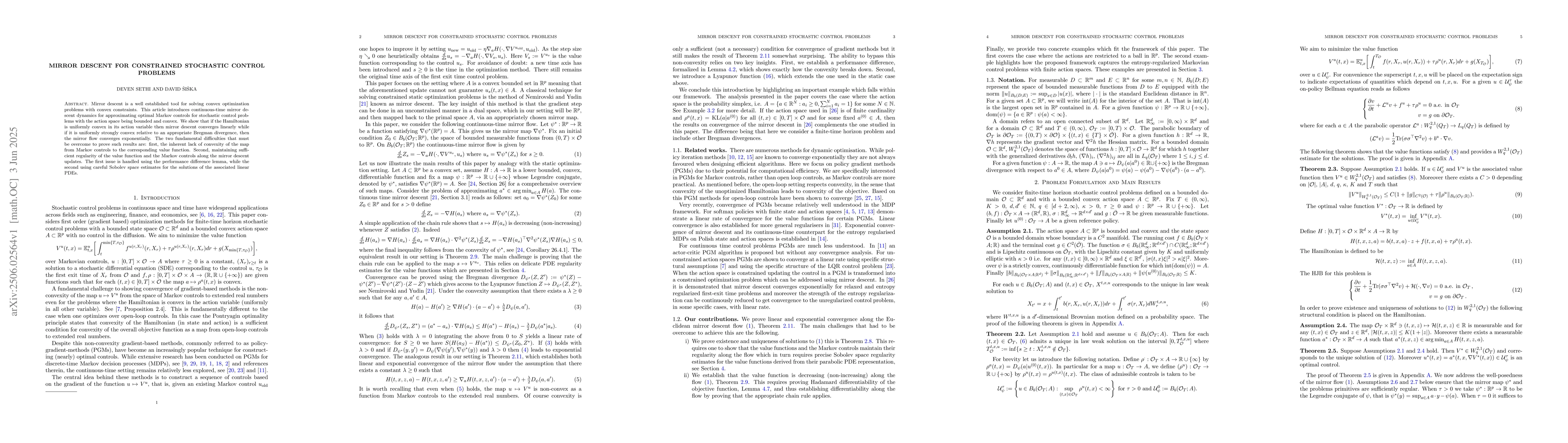 This paper introduces continuous-time mirror descent dynamics to approximate optimal controls for stochastic control problems with bounded, convex action spaces. It proves linear convergence under uniform convexity in the action variable and exponential convergence under uniform strong convexity relative to a Bregman divergence. The method tackles lack of convexity in mapping from controls to value functions and maintains value function and control regularity via performance difference lemma and Sobolev space estimates.