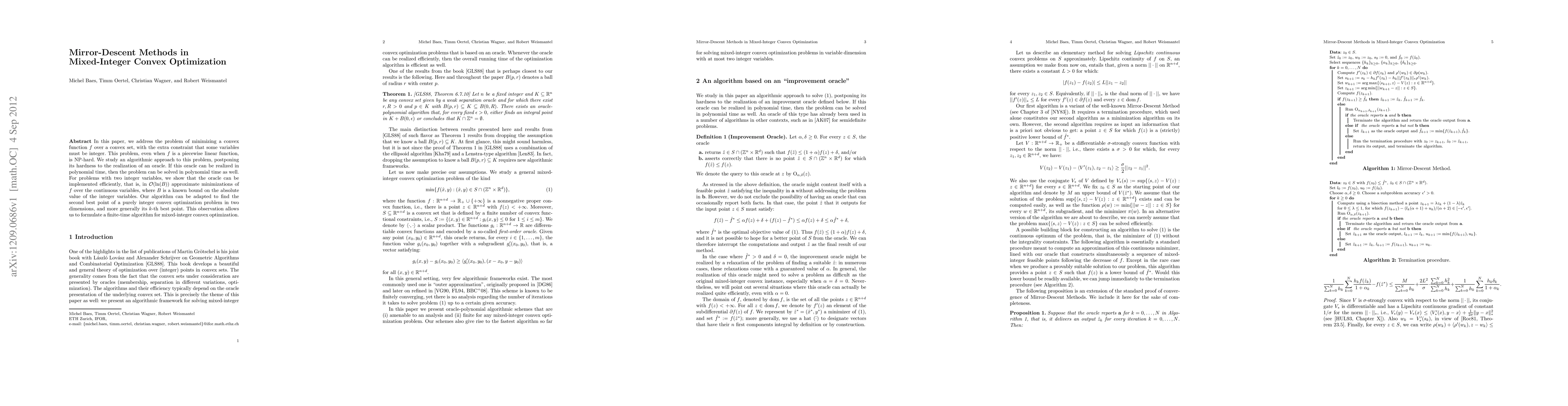 This paper proposes an algorithmic approach for minimizing convex functions subject to mixed-integer constraints, leveraging mirror-descent methods. It demonstrates efficient implementation of an oracle for two-dimensional problems, enabling polynomial-time solutions if the oracle can be realized in polynomial time.