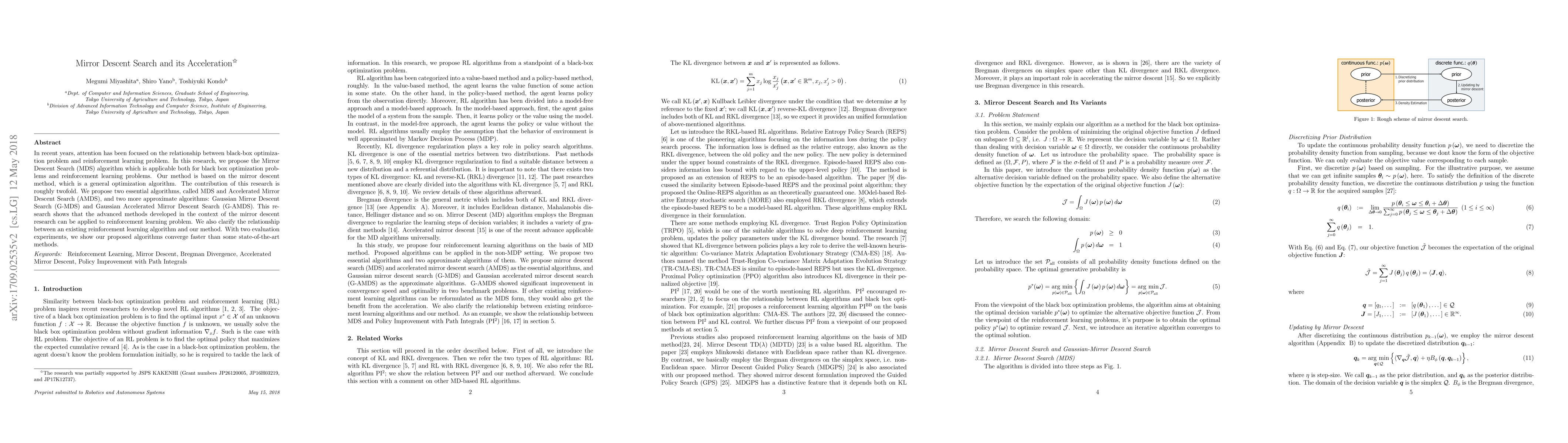In recent years, attention has been focused on the relationship between black-box optimiza- tion problem and reinforcement learning problem. In this research, we propose the Mirror Descent Search (MDS) algorithm which is applicable both for black box optimization prob- lems and reinforcement learning problems. Our method is based on the mirror descent method, which is a general optimization algorithm. The contribution of this research is roughly twofold. We propose two essential algorithms, called MDS and Accelerated Mirror Descent Search (AMDS), and two more approximate algorithms: Gaussian Mirror Descent Search (G-MDS) and Gaussian Accelerated Mirror Descent Search (G-AMDS). This re- search shows that the advanced methods developed in the context of the mirror descent research can be applied to reinforcement learning problem. We also clarify the relationship between an existing reinforcement learning algorithm and our method. With two evaluation experiments, we show our proposed algorithms converge faster than some state-of-the-art methods.