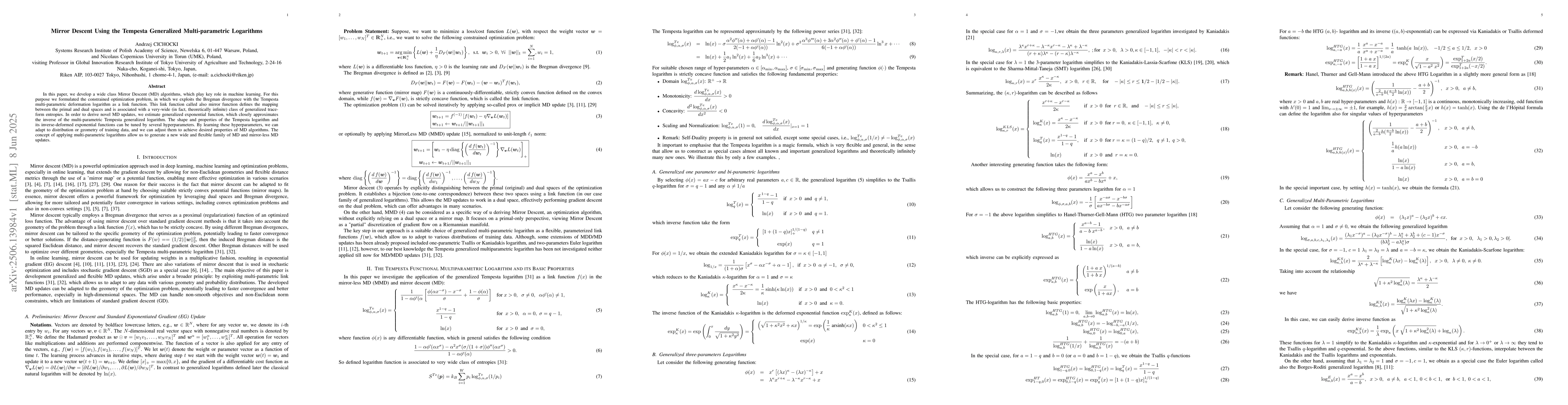 The paper develops a wide class of Mirror Descent (MD) algorithms using the Tempesta generalized multi-parametric logarithms, formulating a constrained optimization problem with Bregman divergence and a link function based on these logarithms.