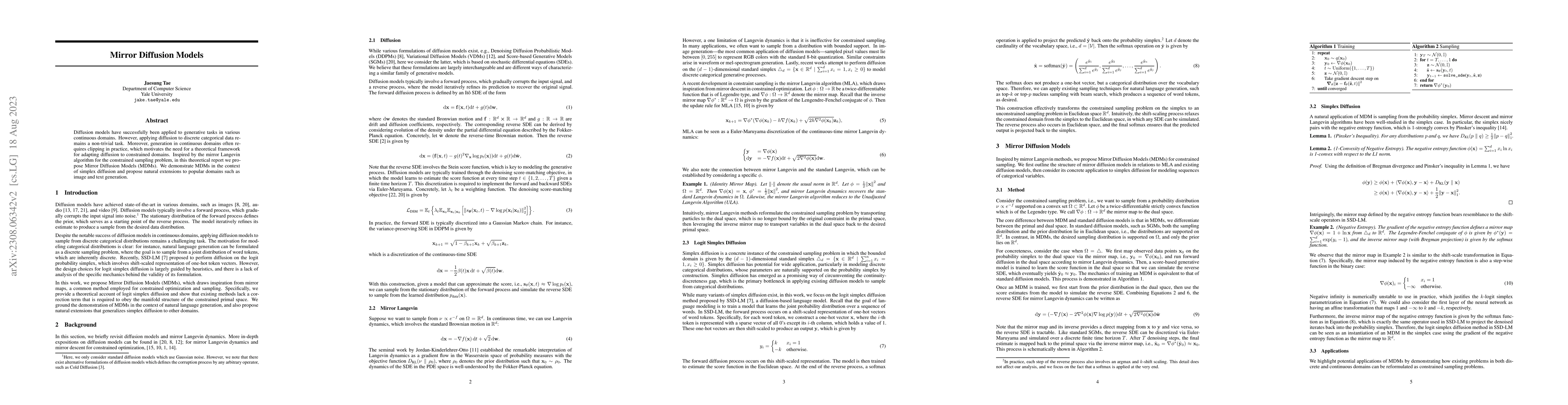 Mirror Diffusion Models (MDMs) propose a theoretical framework for adapting diffusion models to constrained continuous domains, inspired by the mirror Langevin algorithm. The authors demonstrate MDMs in the context of simplex diffusion and extend the approach to image and text generation.