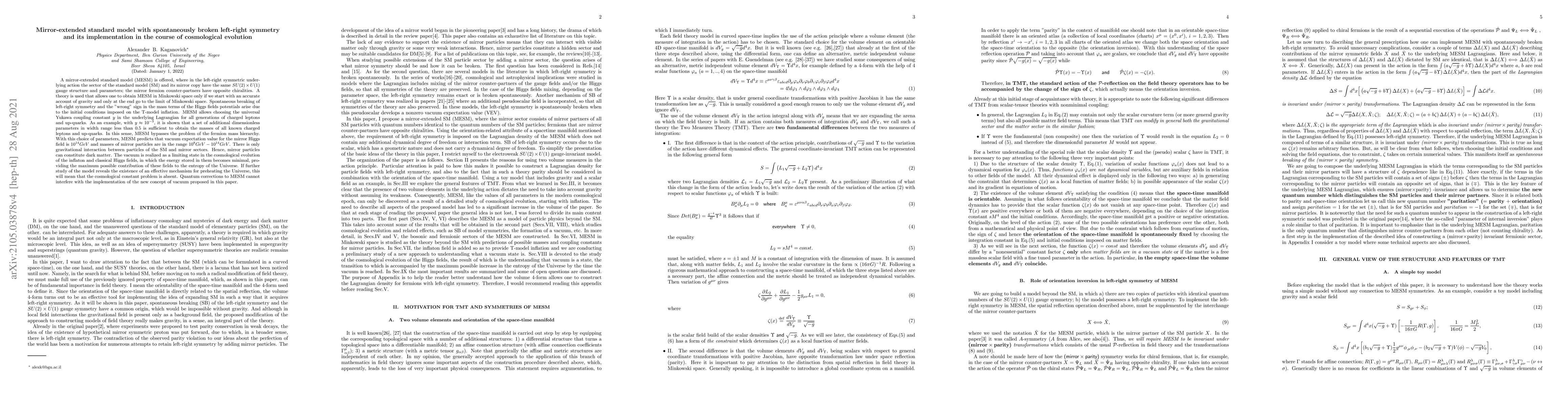 The paper proposes a mirror-extended standard model (MESM) with a left-right symmetric gauge structure, where the spontaneous breaking of symmetry resolves the fermion mass hierarchy. Mirror particles, interacting only gravitationally, could constitute dark matter.