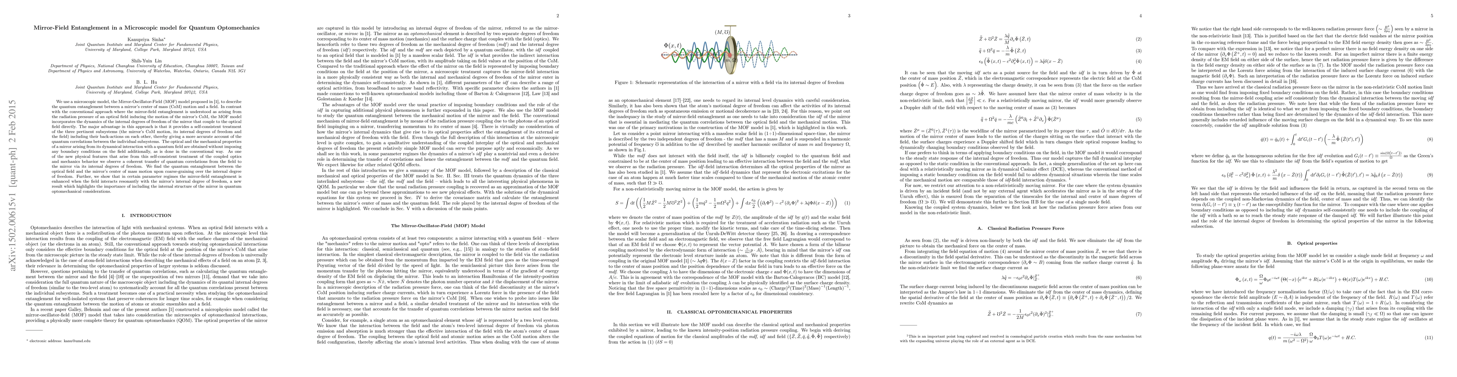 We use a microscopic model, the Mirror-Oscillator-Field (MOF) model proposed by Galley, Behunin and Hu [Phys. Rev. A 87, 043832 (2013)], to describe the quantum entanglement between a mirror's center of mass (CoM) motion and a field. In contrast with the conventional approach where the mirror-field entanglement is understood as arising from the radiation pressure of an optical field inducing the motion of the mirror's CoM, the MOF model incorporates the dynamics of the internal degrees of freedom of the mirror that couple to the optical field directly. The major advantage in this approach is that it provides a self-consistent treatment of the three pertinent subsystems (the mirror's CoM motion, its internal degrees of freedom and the field) including their back-actions on each other, thereby giving a more accurate account of the quantum correlations between the individual subsystems. The optical and the mechanical properties of a mirror arising from its dynamical interaction with a quantum field are obtained without imposing any boundary conditions on the field additionally, as is done in the conventional way. As one of the new physical features that arise from this self-consistent treatment of the coupled optics and mechanics behavior we observe a coherent transfer of quantum correlations from the field to the mirror via its internal degrees of freedom. We find the quantum entanglement between the optical field and the mirror's center of mass motion upon coarse-graining over the internal degree of freedom. Further, we show that in certain parameter regimes the mirror-field entanglement is enhanced when the field interacts resonantly with the mirror's internal degree of freedom, a new result which highlights the importance of including the internal structure of the mirror in quantum optomechanical studies.
