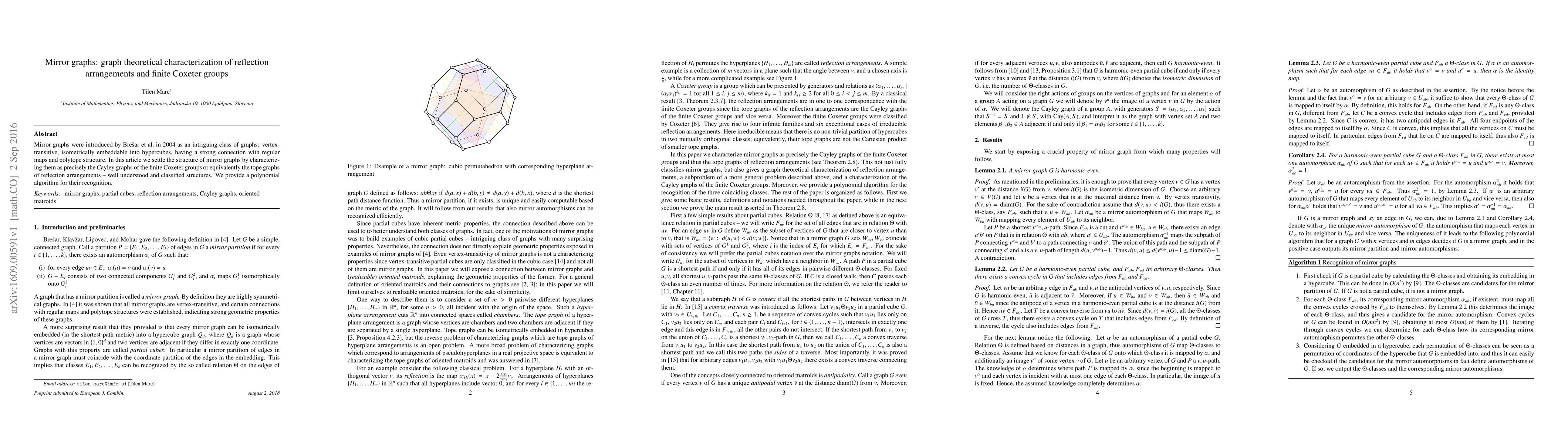 This paper characterizes mirror graphs as Cayley graphs of finite Coxeter groups and tope graphs of reflection arrangements. It also presents a polynomial algorithm for recognizing these graphs.