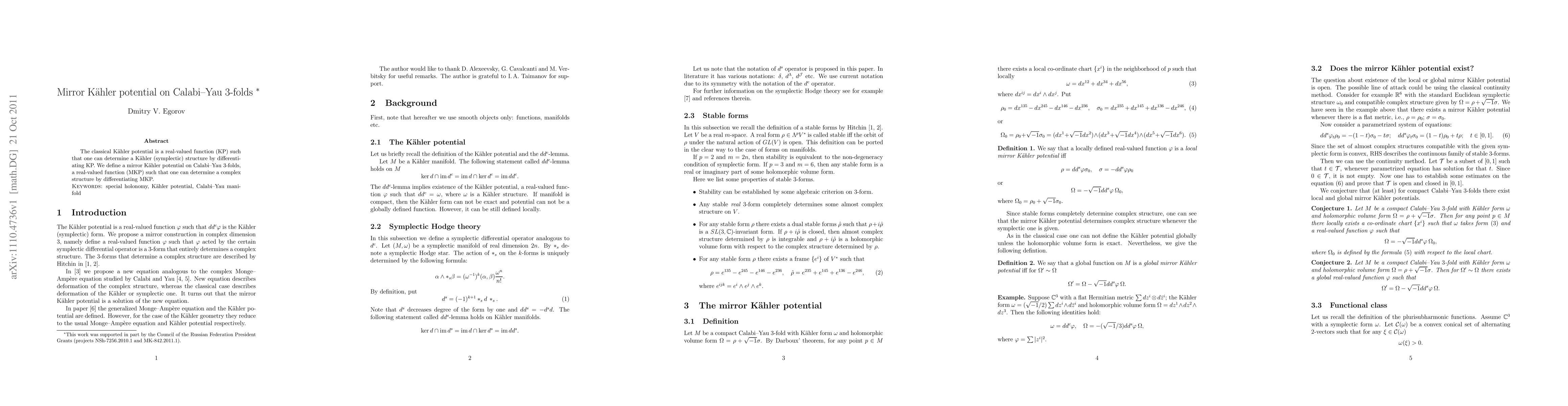 The classical Kaehler potential is a real-valued function (KP) such that one can determine a Kaehler (symplectic) structure by differentiating KP. We define a mirror Kaehler potential on Calabi-Yau 3-folds, a real-valued function (MKP) such that one can determine a complex structure by differentiating MKP.