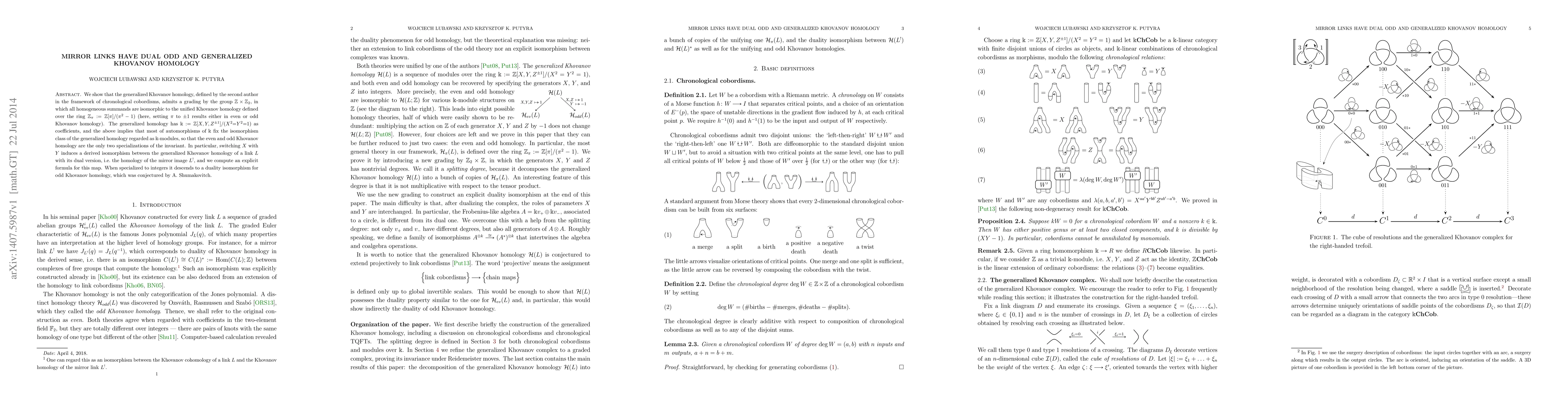 The paper establishes that generalized Khovanov homology features a $\mathbb{Z}\times\mathbb{Z}_2$ grading, linking it to unified Khovanokov homology. It shows a duality between a link and its mirror image via an explicit map derived from switching variables in the coefficient ring.
