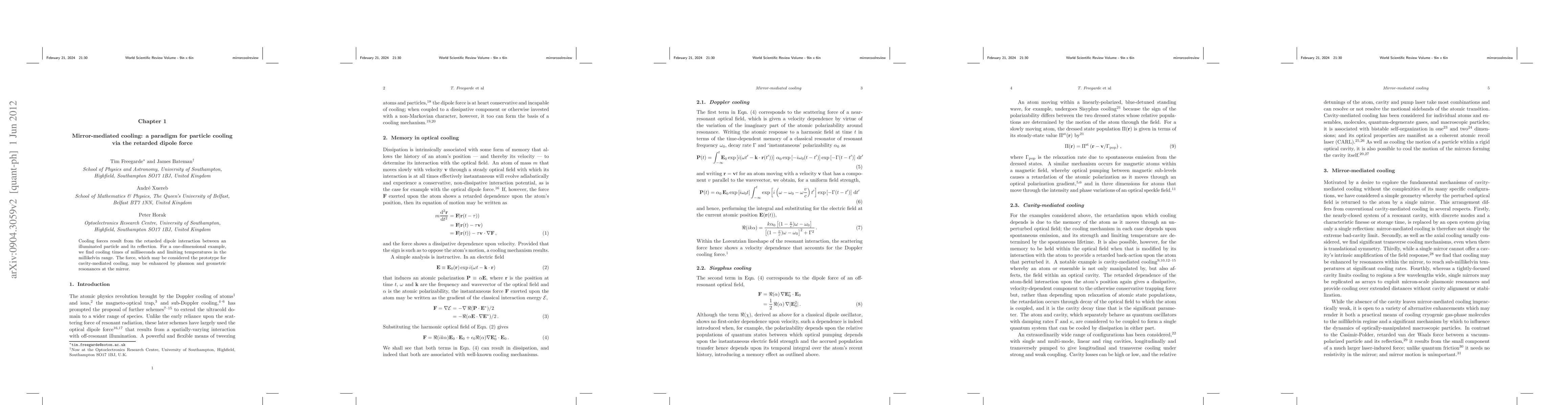 Cooling forces result from the retarded dipole interaction between an illuminated particle and its reflection. For a one-dimensional example, we find cooling times of milliseconds and limiting temperatures in the millikelvin range. The force, which may be considered the prototype for cavity-mediated cooling, may be enhanced by plasmon and geometric resonances at the mirror.