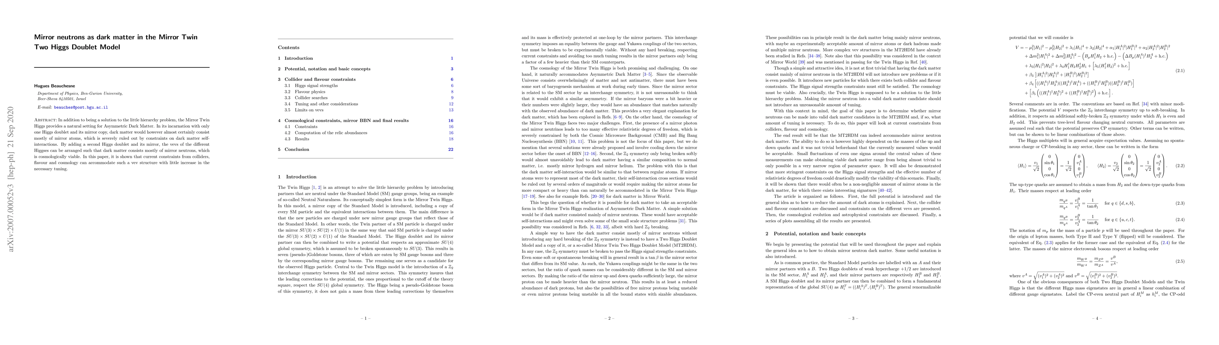 This paper explores the Mirror Twin Two Higgs Doublet Model as a solution for asymmetric dark matter, proposing that mirror neutrons could serve as viable dark matter candidates. It demonstrates that with a second Higgs doublet and its mirror, the model can accommodate current constraints from colliders, flavor physics, and cosmology with minimal additional tuning.