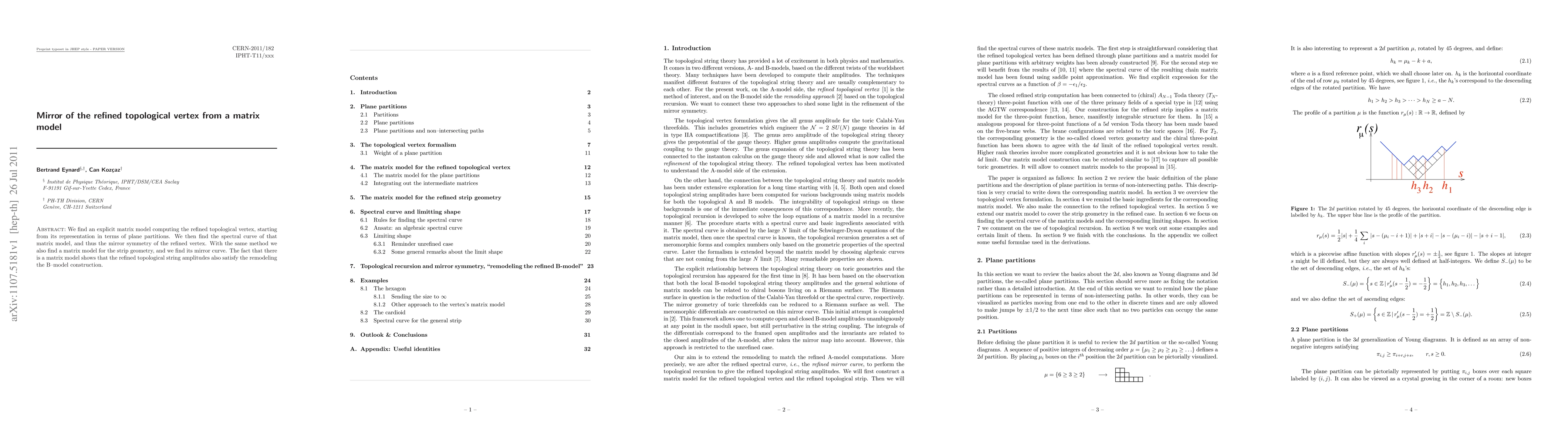 This paper develops a matrix model to compute the refined topological vertex using plane partitions and identifies its spectral curve, establishing mirror symmetry. It also extends the method to find a matrix model and its mirror curve for strip geometries, confirming the remodeling of B-model construction for refined topological string amplitudes.