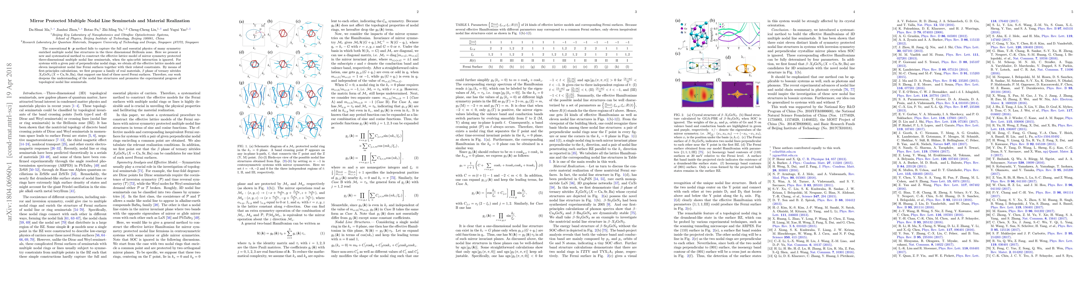 The conventional k.p method fails to capture the full and essential physics of many symmetry enriched multiple nodal line structures in the three dimensional Brillouin zone. Here we present a new and systematical method to construct the effective lattice model of mirror symmetry protected three-dimensional multiple nodal line semimetals, when the spin-orbit interaction is ignored. For systems with a given pair of perpendicular nodal rings, we obtain all the effective lattice models and eleven inequivalent nodal line Fermi surfaces together with their related constraints. By means of first-principles calculations, we first propose a family of real materials, beta phase of ternary nitrides X2GeN2 (X = Ca; Sr; Ba), that support one kind of these novel Fermi surfaces. Therefore, our work deepens the understanding of the nodal line structures and promotes the experimental progress of topological nodal line semimetals.