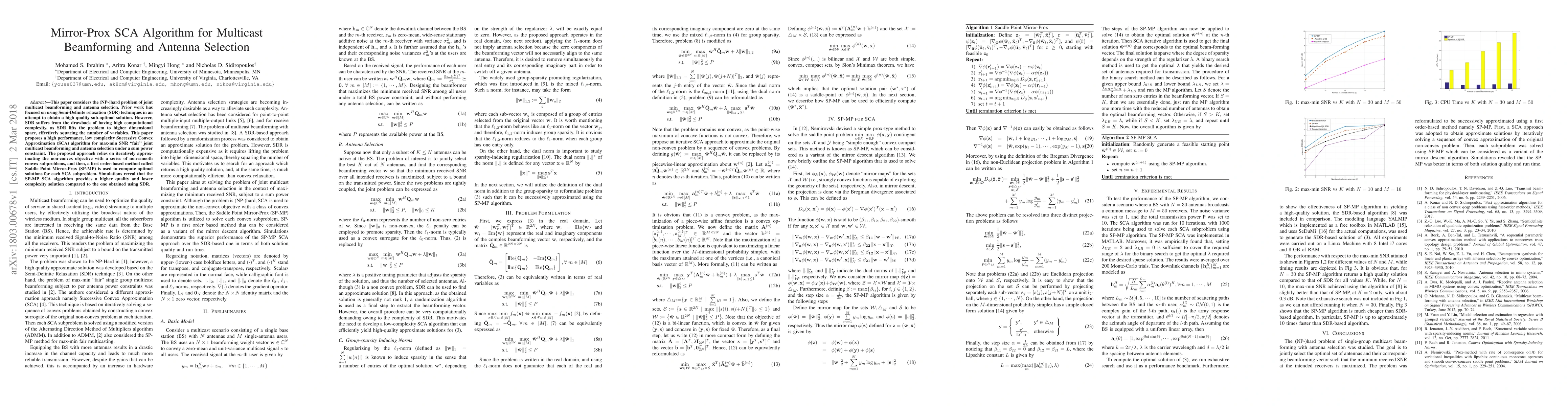 This paper proposes a low-complexity Successive Convex Approximation (SCA) algorithm with Saddle Point Mirror-Prox (SP-MP) for joint multicast beamforming and antenna selection, achieving higher quality solutions compared to Semi-Definite Relaxation (SDR) techniques.