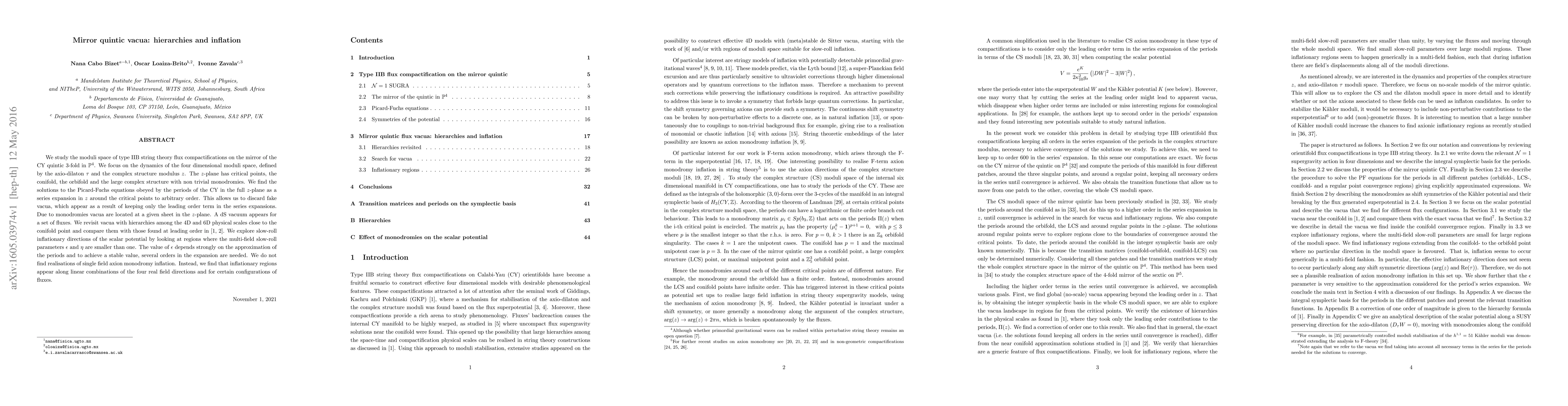 This paper investigates the moduli space of type IIB string theory on the mirror of the CY quintic 3-fold, focusing on the dynamics of four-dimensional moduli space defined by the axio-dilaton and complex structure modulus. It finds solutions to Picard-Fuchs equations to determine genuine vacua and explores inflationary directions in the scalar potential, concluding that single field axion monodromy inflation is not realized but multi-field inflation is possible.