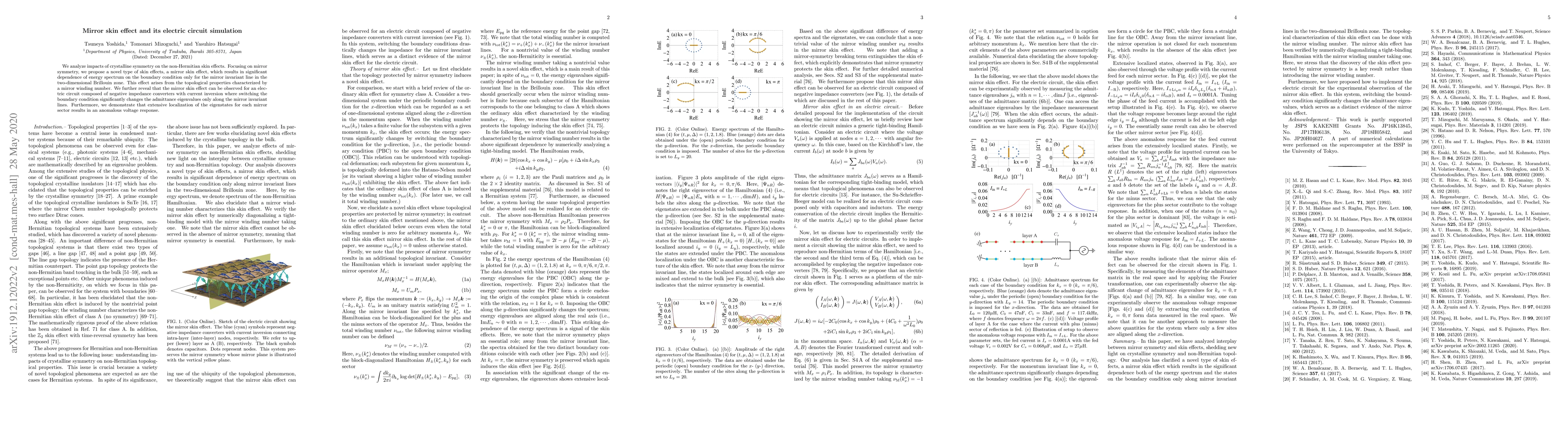 This paper introduces the mirror skin effect, a novel phenomenon arising from mirror symmetry in non-Hermitian systems, characterized by a topological mirror winding number. It also demonstrates the effect's simulation in an electric circuit using negative impedance converters, showing significant changes in admittance eigenvalues along mirror invariant lines.