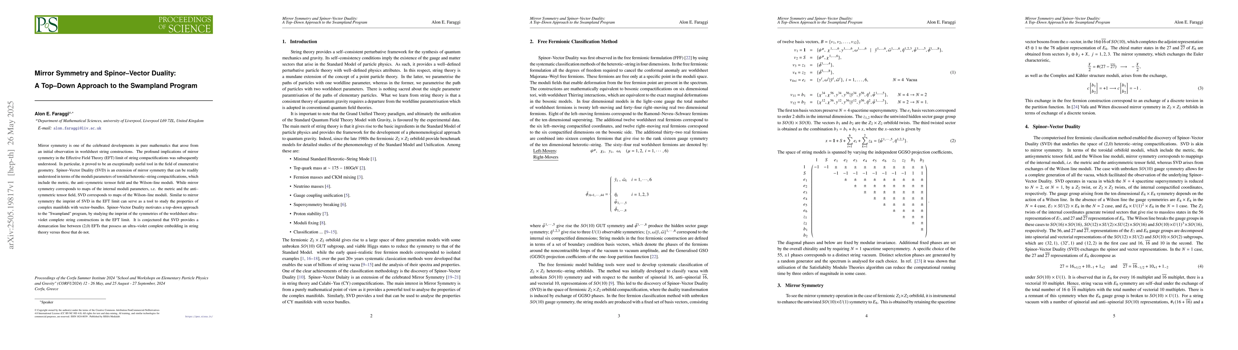 The introduction and application of Spinor-Vector Duality as a means to study the Swampland program, extending mirror symmetry concepts to Wilson-line moduli.