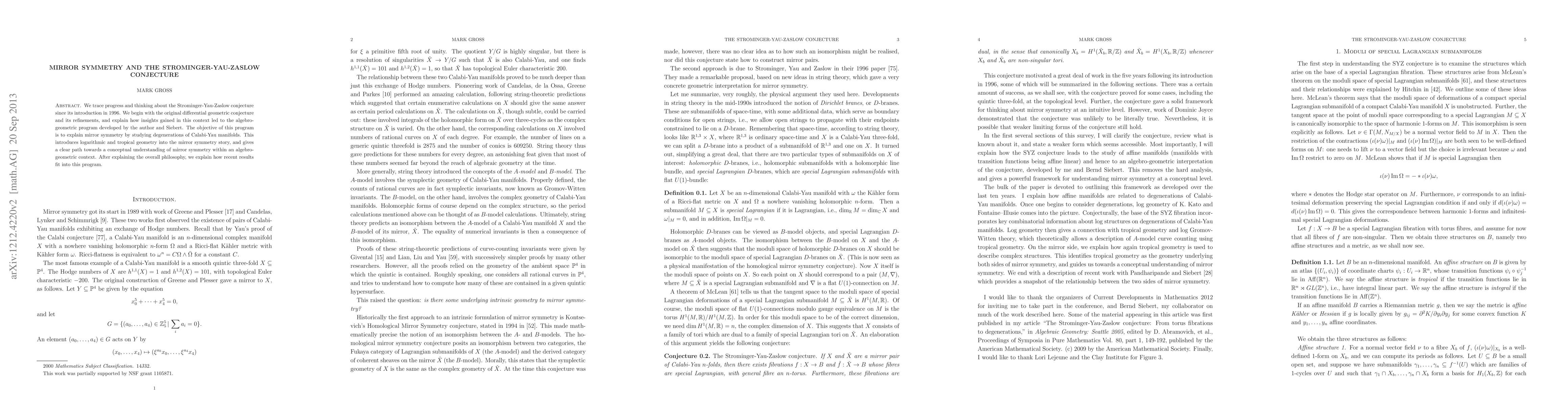 This survey was written for the Current Developments in Mathematics conference, 2012, and is an updating of my article "The Strominger-Yau-Zaslow conjecture: From torus fibrations to degenerations," in the Seattle 2005 proceedings. We trace progress and thinking about the SYZ conjecture since its introduction in 1996. We begin with the original differential geometric conjecture and its refinements, and explain how it led to the algebro-geometric program developed by myself and Siebert. After explaining the overall philosophy, I explain how recent results fit into this program.