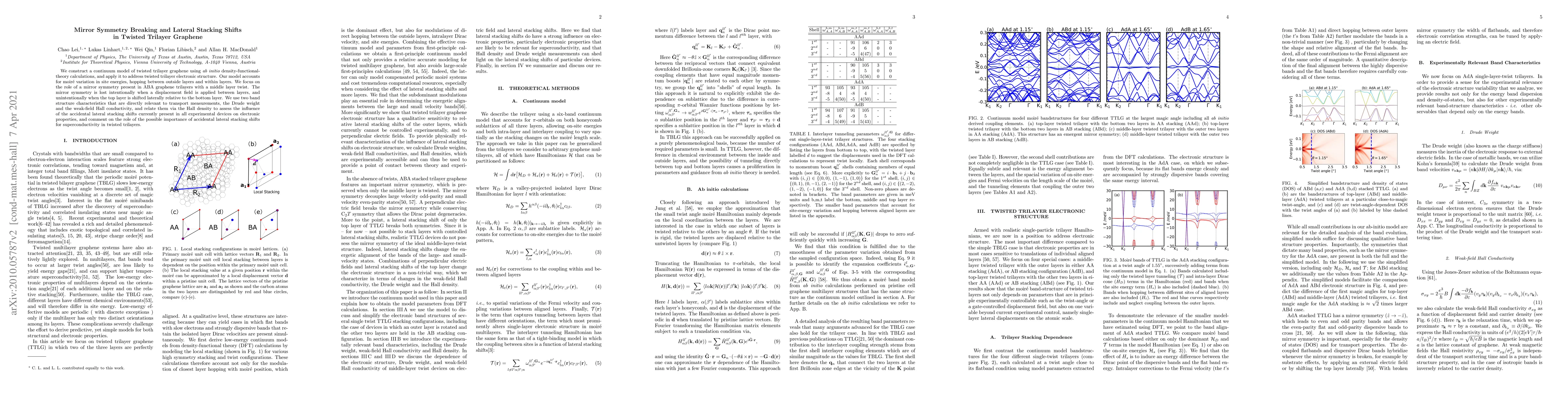 We construct a continuum model of twisted trilayer graphene using {\it ab initio} density-functional-theory calculations, and apply it to address twisted trilayer electronic structure. Our model accounts for moir\'e variation in site energies, hopping between outside layers and within layers. We focus on the role of a mirror symmetry present in ABA graphene trilayers with a middle layer twist. The mirror symmetry is lost intentionally when a displacement field is applied between layers, and unintentionally when the top layer is shifted laterally relative to the bottom layer. We use two band structure characteristics that are directly relevant to transport measurements, the Drude weight and the weak-field Hall conductivity, and relate them via the Hall density to assess the influence of the accidental lateral stacking shifts currently present in all experimental devices on electronic properties, and comment on the role of the possible importance of accidental lateral stacking shifts for superconductivity in twisted trilayers.