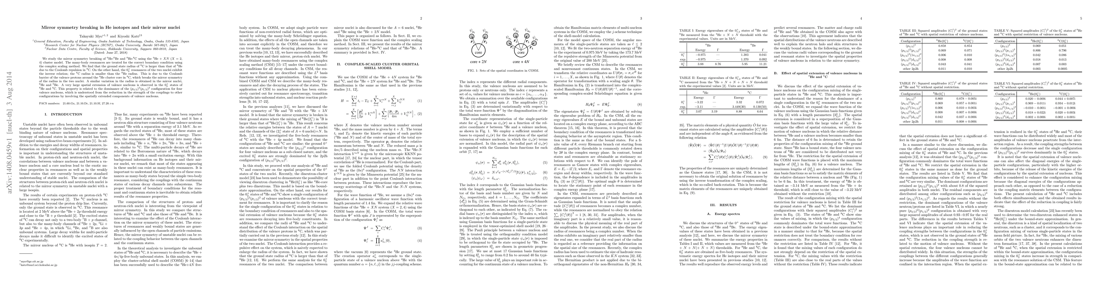 This study investigates mirror symmetry breaking in $^6$He-$^6$Be and $^8$He-$^8$C using a cluster model, revealing that $^8$C has a larger ground state radius than $^8$He due to Coulomb repulsion, while the $0^+_2$ resonances show an inverse relation due to the Coulomb barrier effect. The paper highlights the significant spatial extension of valence nucleons in the $0^+_2$ states of $^8$He and $^8$C, attributed to the dominance of specific nucleon configurations.