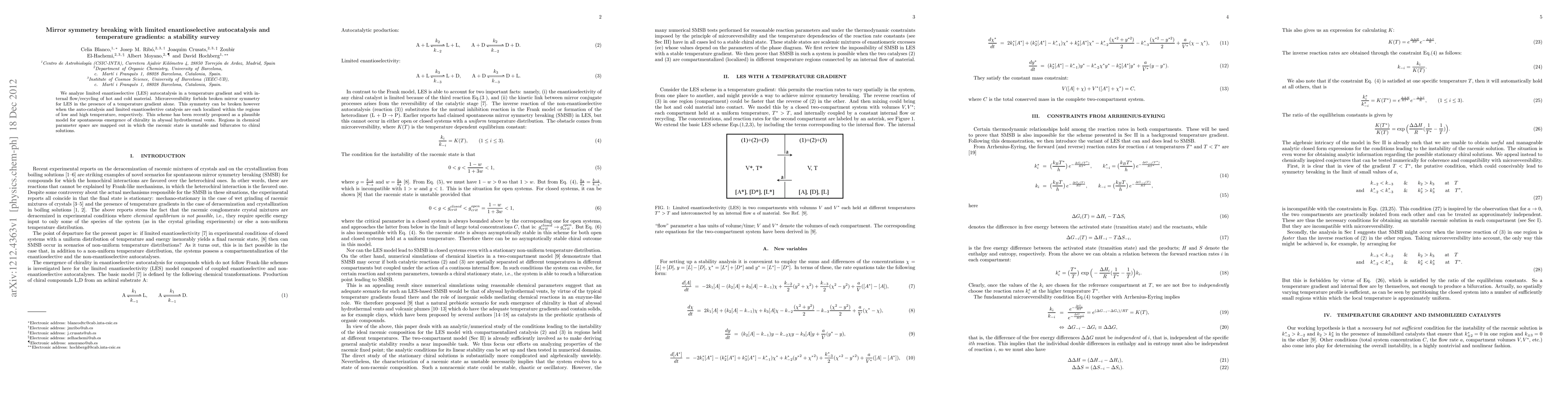 This study explores how limited enantioselective autocatalysis and temperature gradients can break mirror symmetry, leading to the emergence of chirality. It finds that localized auto-catalysis in low-temperature regions and limited enantioselective catalysis in high-temperature regions can induce chirality, providing a model for chirality in hydrothermal vents.