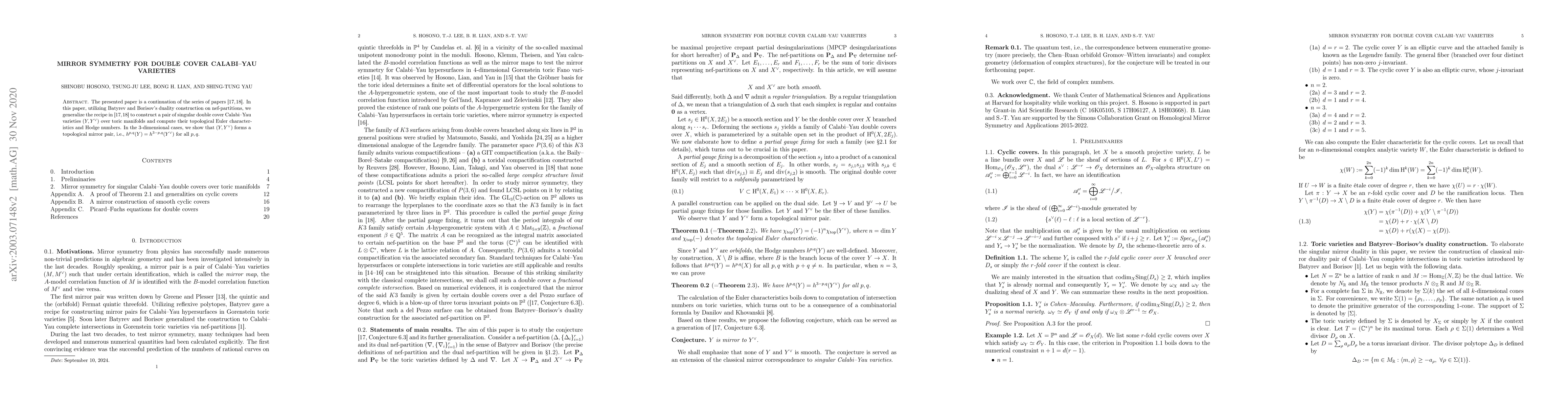 The presented paper is a continuation of the series of papers arXiv:1810.00606 and arXiv:1903.09373. In this paper, utilizing Batyrev and Borisov's duality construction on nef-partitions, we generalize the recipe in arXiv:1810.00606 and arXiv:1903.09373 to construct a pair of singular double cover Calabi--Yau varieties $(Y,Y^{\vee})$ over toric manifolds and compute their topological Euler characteristics and Hodge numbers. In the $3$-dimensional cases, we show that $(Y,Y^{\vee})$ forms a topological mirror pair, i.e., $h^{p,q}(Y)=h^{3-p,q}(Y^{\vee})$ for all $p,q$.