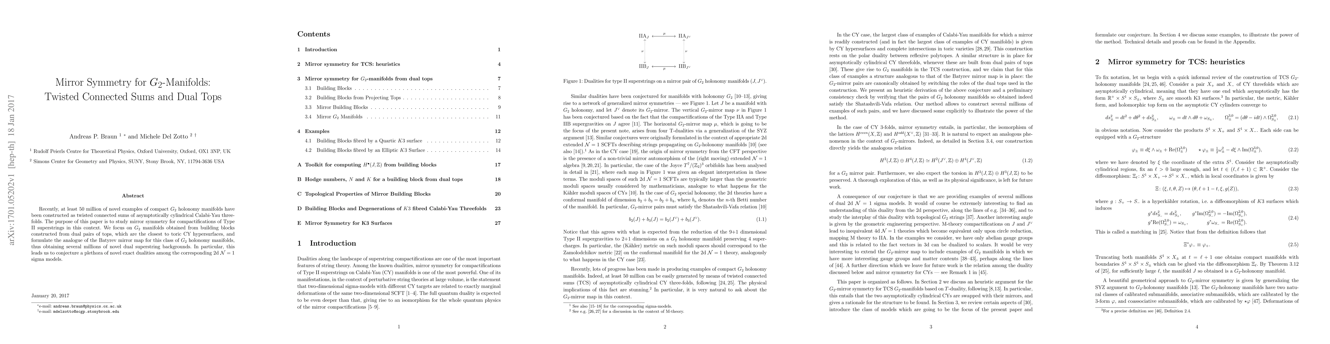 Recently, at least 50 million of novel examples of compact $G_2$ holonomy manifolds have been constructed as twisted connected sums of asymptotically cylindrical Calabi-Yau threefolds. The purpose of this paper is to study mirror symmetry for compactifications of Type II superstrings in this context. We focus on $G_2$ manifolds obtained from building blocks constructed from dual pairs of tops, which are the closest to toric CY hypersurfaces, and formulate the analogue of the Batyrev mirror map for this class of $G_2$ holonomy manifolds, thus obtaining several millions of novel dual superstring backgrounds. In particular, this leads us to conjecture a plethora of novel exact dualities among the corresponding 2d N=1 sigma models.