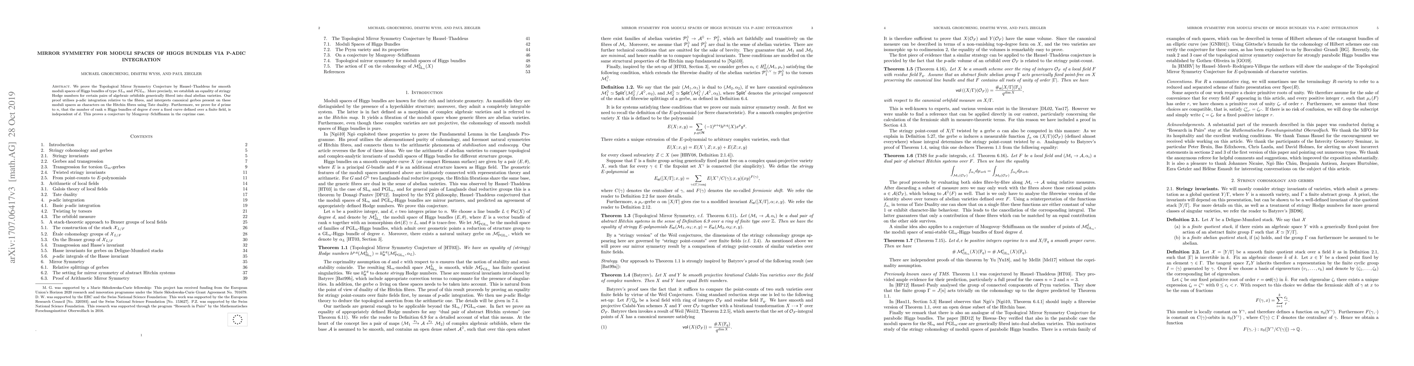 The paper establishes Topological Mirror Symmetry for moduli spaces of Higgs bundles by proving an equality of stringy Hodge numbers using p-adic integration, and confirms a conjecture about the independence of the number of rank $n$ Higgs bundles over finite fields when the degree is coprime to $n$.