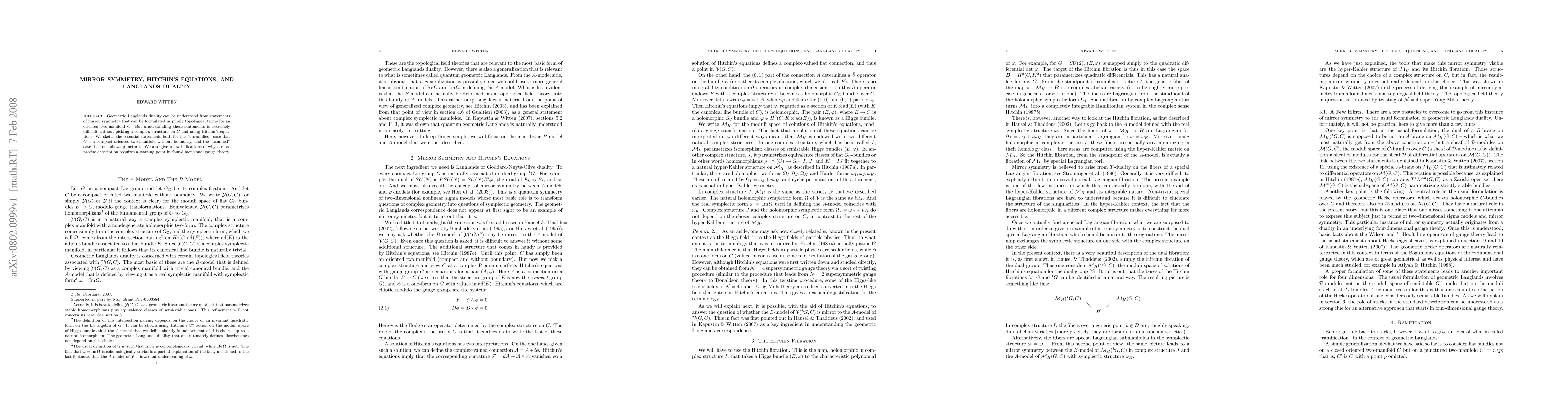 This paper explores the connection between geometric Langlands duality and mirror symmetry through Hitchin's equations, emphasizing the necessity of choosing a complex structure on the two-manifold $C$. It outlines the implications for both unramified and ramified cases, suggesting that a detailed understanding requires foundational insights from four-dimensional gauge theory.