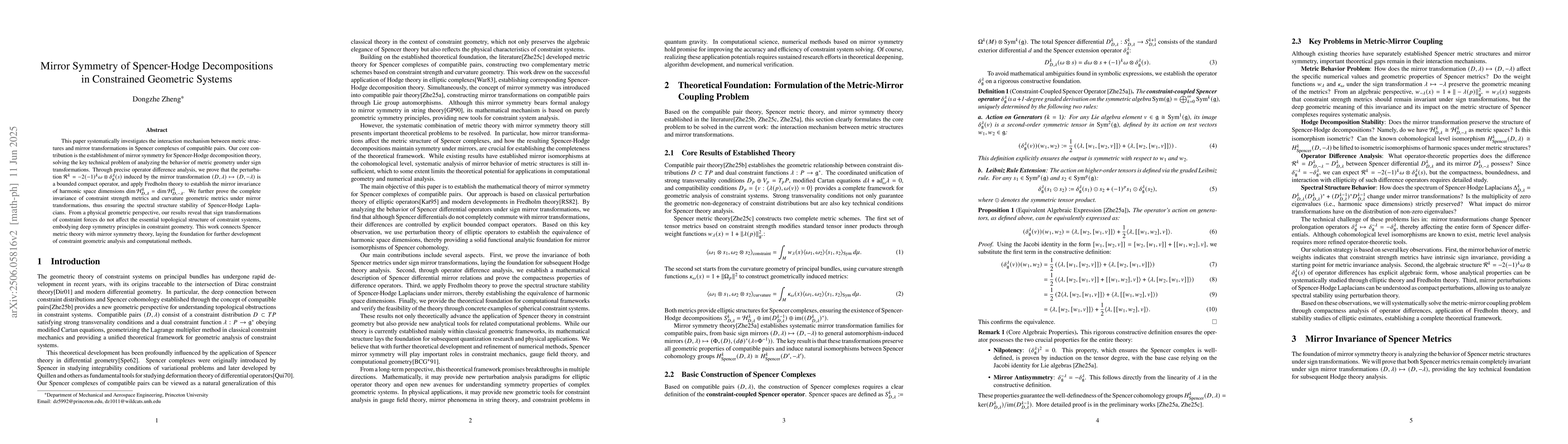 The paper establishes mirror symmetry for Spencer-Hodge decomposition theory in constrained geometric systems, showing that sign transformations do not affect the topological structure of constraint systems.
