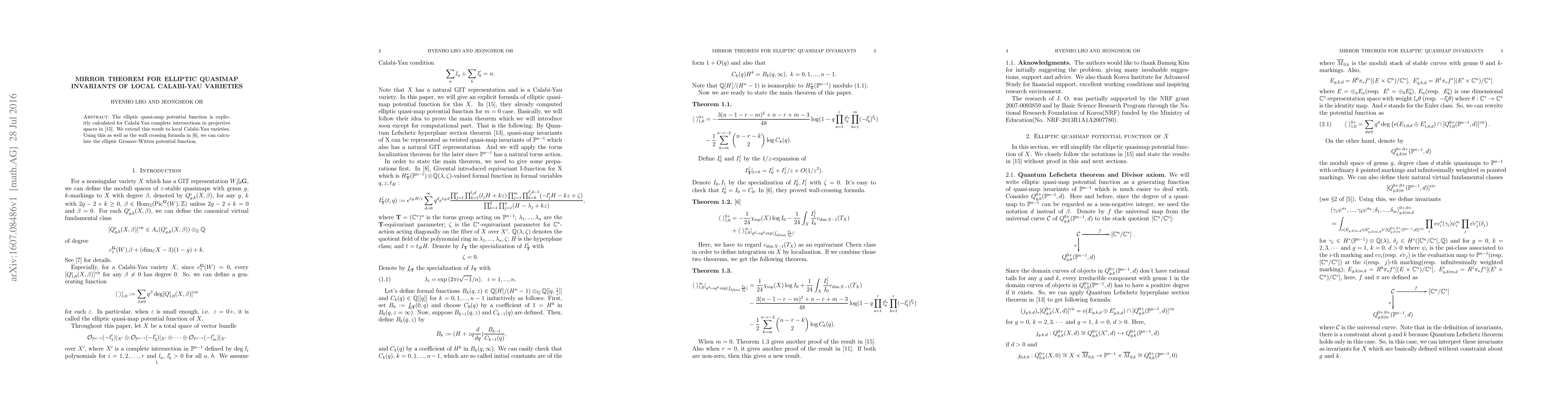 Summary: Kim and Lho's elliptic quasimap potential function is extended from Calabi-Yau complete intersections to local Calabi-Yau varieties, enabling the calculation of the elliptic Gromov-Witten potential using the wall crossing formula by Ciocan-Fontanine and Kim.