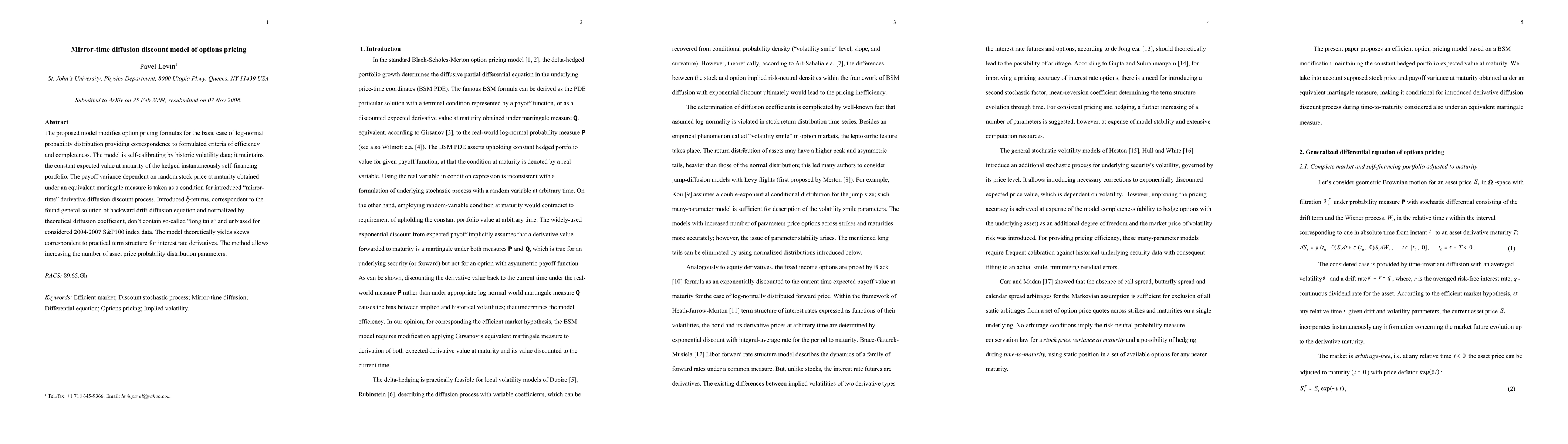 The proposed model modifies option pricing formulas for the basic case of log-normal probability distribution providing correspondence to formulated criteria of efficiency and completeness. The model is self-calibrating by historic volatility data; it maintains the constant expected value at maturity of the hedged instantaneously self-financing portfolio. The payoff variance dependent on random stock price at maturity obtained under an equivalent martingale measure is taken as a condition for introduced "mirror-time" derivative diffusion discount process. Introduced ksi-return distribution, correspondent to the found general solution of backward drift-diffusion equation and normalized by theoretical diffusion coefficient, does not contain so-called "long tails" and unbiased for considered 2004-2007 S&P 100 index data. The model theoretically yields skews correspondent to practical term structure for interest rate derivatives. The method allows increasing the number of asset price probability distribution parameters.