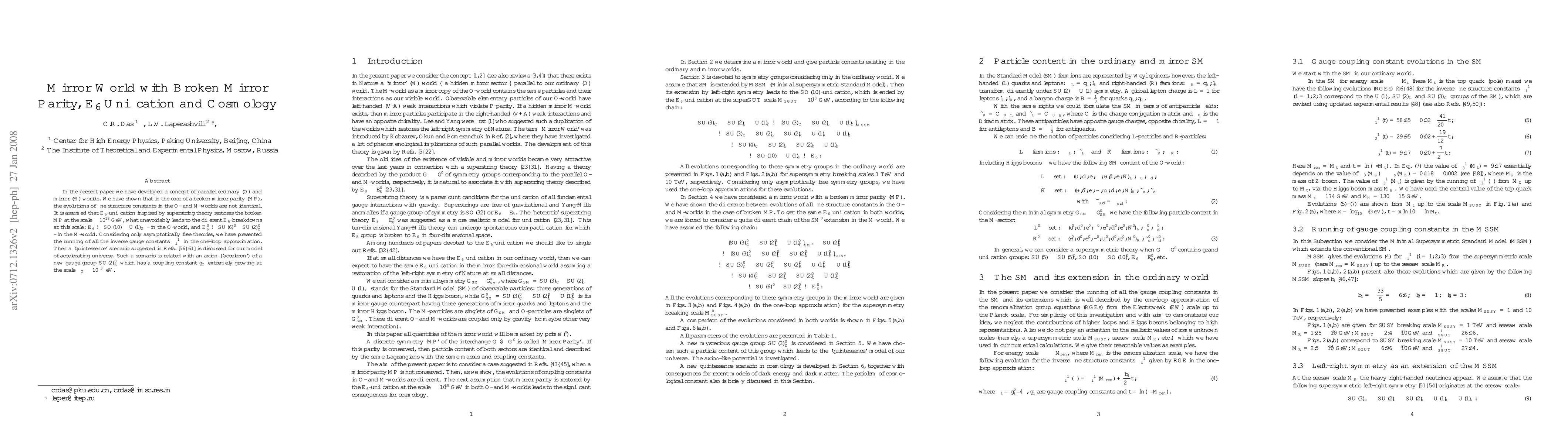 In the present paper we have developed a concept of parallel ordinary (O) and mirror (M) worlds. We have shown that in the case of a broken mirror parity (MP), the evolutions of fine structure constants in the O- and M-worlds are not identical. It is assumed that E_6-unification inspired by superstring theory restores the broken MP at the scale \sim 10^{18} GeV, what unavoidably leads to the different E_6-breakdowns at this scale: E_6 \to SO(10)\times U(1)_Z - in the O-world, and E'_6 \to SU(6)'\times SU(2)'_Z - in the M-world. Considering only asymptotically free theories, we have presented the running of all the inverse gauge constants \alpha_i^{-1} in the one-loop approximation. Then a `quintessence' scenario is discussed for our model of accelerating universe. Such a scenario is related with an axion (`acceleron') of a new gauge group SU(2)'_Z which has a coupling constant g_Z extremely growing at the scale \Lambda_Z\sim 10^{-3} eV.