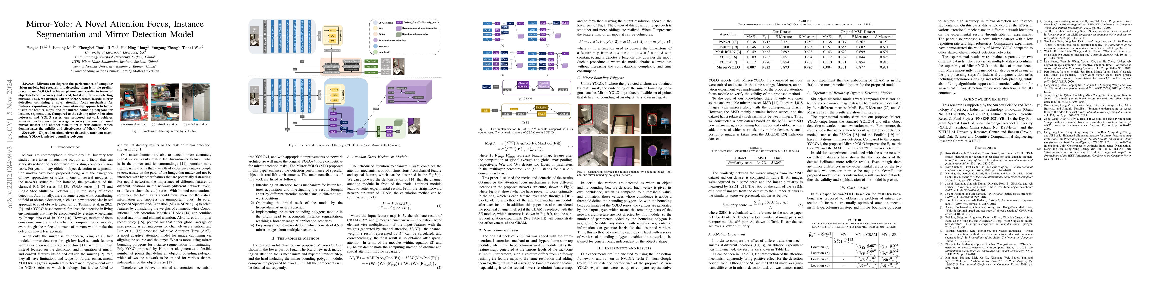 Mirror-YOLO introduces an attention-based instance segmentation and detection model for mirrors, enhancing YOLOv4 with an attention mechanism and feature map fusion for improved mirror detection. Experimental results show superior performance compared to existing methods.