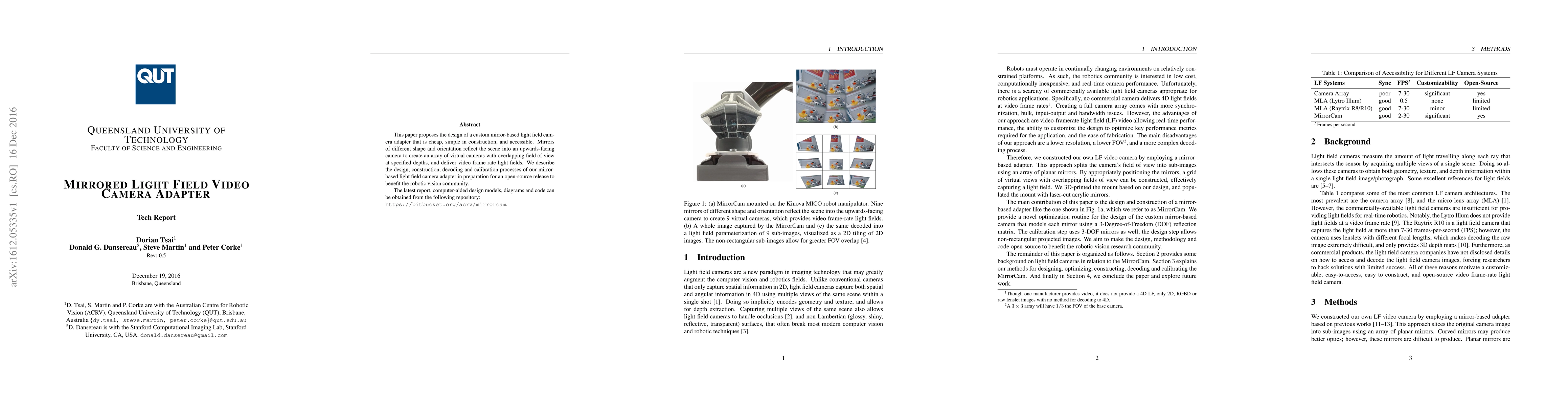 This paper introduces a cost-effective, simple mirror-based light field camera adapter that reflects scenes into an upward-facing camera to generate overlapping virtual camera views at various depths, enabling real-time light field video. The authors detail the design, construction, decoding, and calibration processes for this open-source innovation.