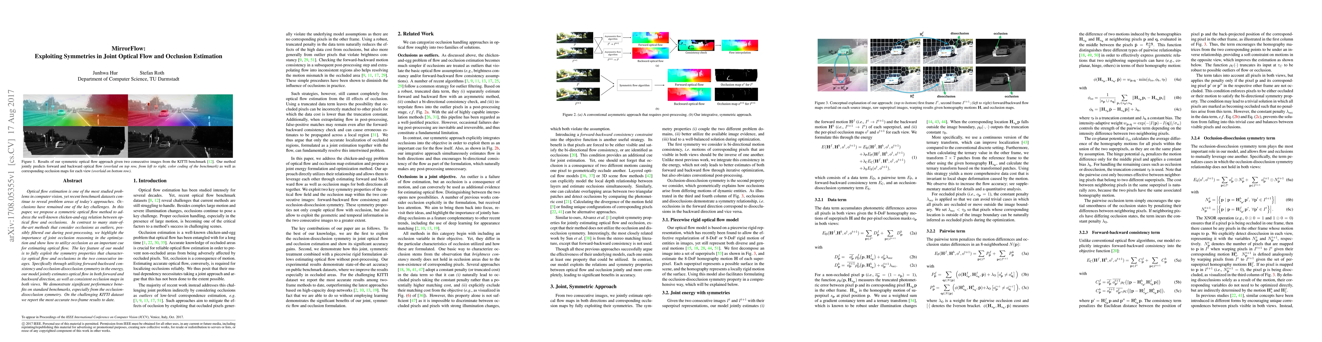 MirrorFlow proposes a symmetric optical flow method that jointly estimates optical flow and occlusions by exploiting symmetry properties in consecutive images, addressing the chicken-and-egg problem between them. The method shows significant performance improvements, especially in handling occlusions, and achieves the most accurate two-frame results on the KITTI dataset.
