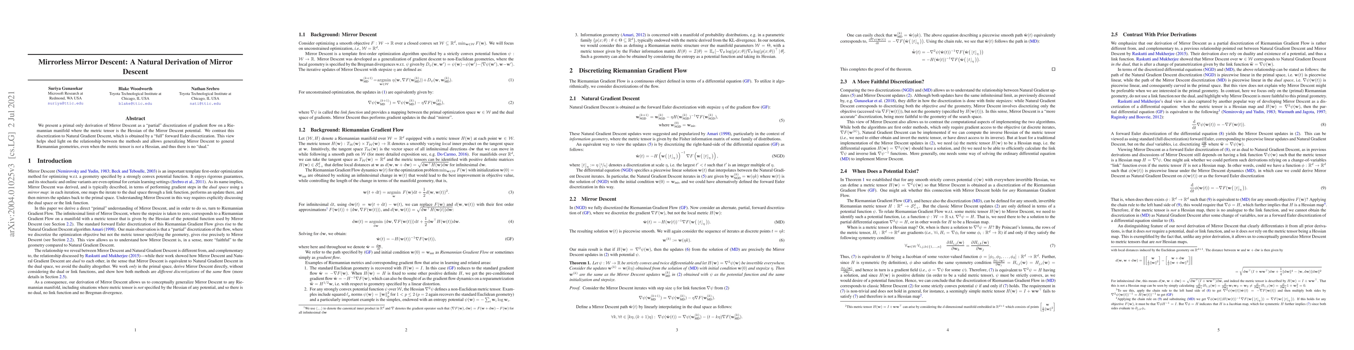 We present a primal only derivation of Mirror Descent as a "partial" discretization of gradient flow on a Riemannian manifold where the metric tensor is the Hessian of the Mirror Descent potential. We contrast this discretization to Natural Gradient Descent, which is obtained by a "full" forward Euler discretization. This view helps shed light on the relationship between the methods and allows generalizing Mirror Descent to general Riemannian geometries, even when the metric tensor is {\em not} a Hessian, and thus there is no "dual."