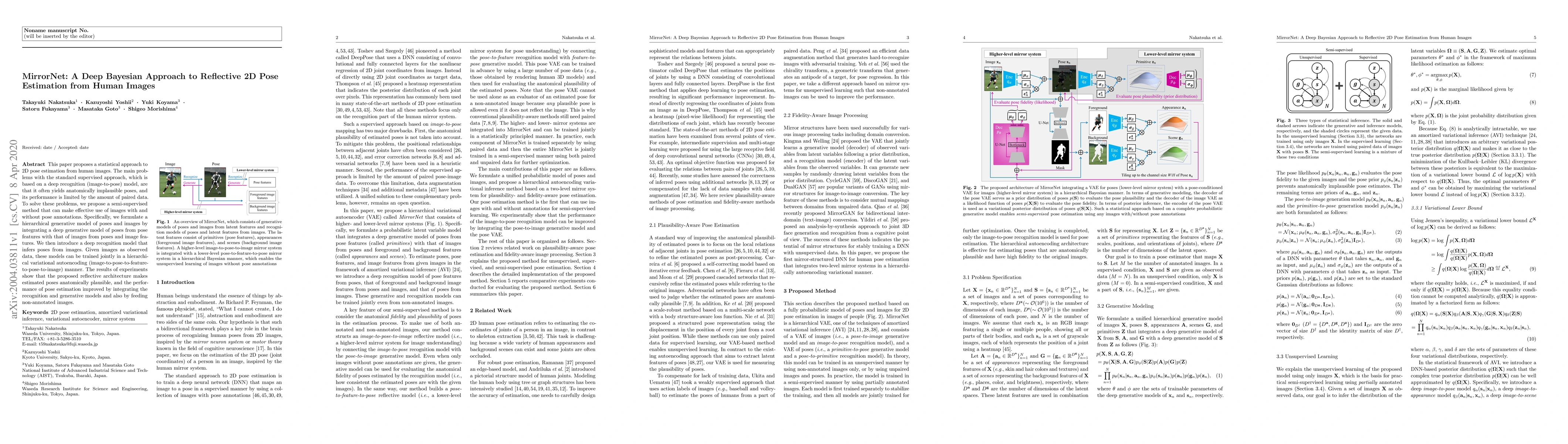 This paper proposes a statistical approach to 2D pose estimation from human images. The main problems with the standard supervised approach, which is based on a deep recognition (image-to-pose) model, are that it often yields anatomically implausible poses, and its performance is limited by the amount of paired data. To solve these problems, we propose a semi-supervised method that can make effective use of images with and without pose annotations. Specifically, we formulate a hierarchical generative model of poses and images by integrating a deep generative model of poses from pose features with that of images from poses and image features. We then introduce a deep recognition model that infers poses from images. Given images as observed data, these models can be trained jointly in a hierarchical variational autoencoding (image-to-pose-to-feature-to-pose-to-image) manner. The results of experiments show that the proposed reflective architecture makes estimated poses anatomically plausible, and the performance of pose estimation improved by integrating the recognition and generative models and also by feeding non-annotated images.