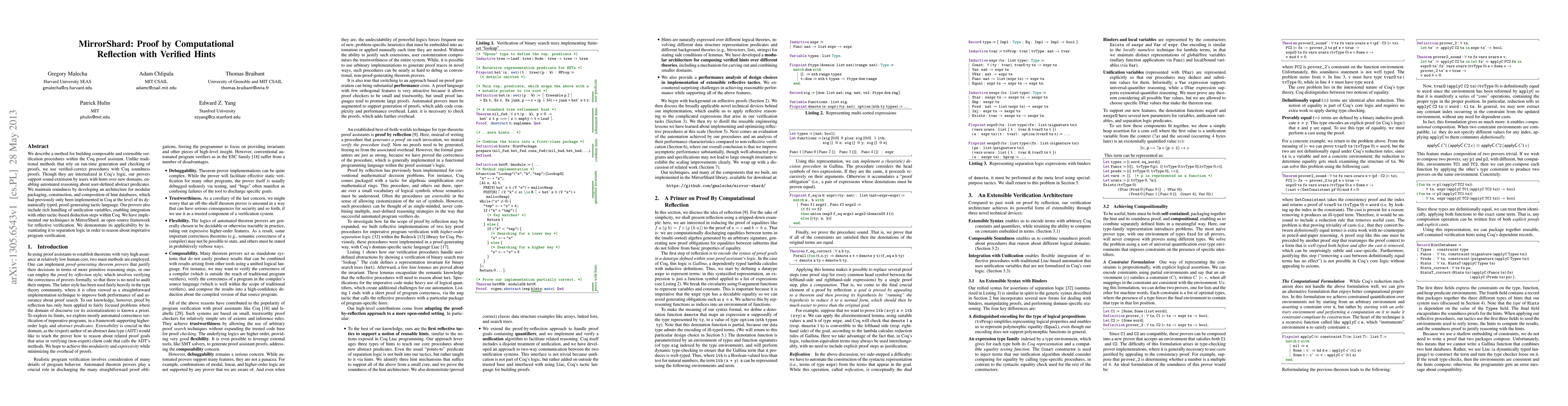 We describe a method for building composable and extensible verification procedures within the Coq proof assistant. Unlike traditional methods that rely on run-time generation and checking of proofs, we use verified-correct procedures with Coq soundness proofs. Though they are internalized in Coq's logic, our provers support sound extension by users with hints over new domains, enabling automated reasoning about user-defined abstract predicates. We maintain soundness by developing an architecture for modular packaging, construction, and composition of hint databases, which had previously only been implemented in Coq at the level of its dynamically typed, proof-generating tactic language. Our provers also include rich handling of unification variables, enabling integration with other tactic-based deduction steps within Coq. We have implemented our techniques in MirrorShard, an open-source framework for reflective verification. We demonstrate its applicability by instantiating it to separation logic in order to reason about imperative program verification.