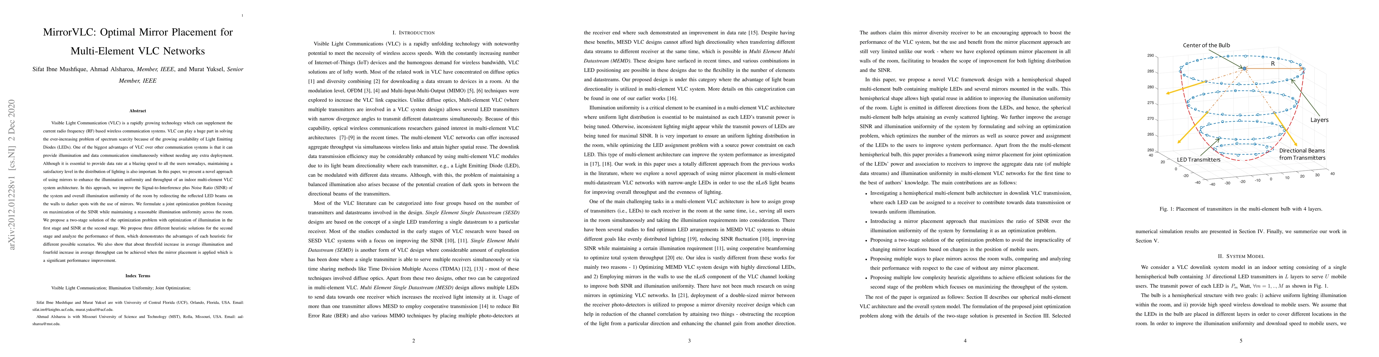 Visible Light Communication (VLC) is a rapidly growing technology which can supplement the current radio frequency (RF) based wireless communication systems. VLC can play a huge part in solving the ever-increasing problem of spectrum scarcity because of the growing availability of Light Emitting Diodes (LEDs). One of the biggest advantages of VLC over other communication systems is that it can provide illumination and data communication simultaneously without needing any extra deployment. Although it is essential to provide data rate at a blazing speed to all the users nowadays, maintaining a satisfactory level in the distribution of lighting is also important. In this paper, we present a novel approach of using mirrors to enhance the illumination uniformity and throughput of an indoor multi-element VLC system architecture. In this approach, we improve the Signal-to-Interference plus Noise Ratio (SINR) of the system and overall illumination uniformity of the room by redirecting the reflected LED beams on the walls to darker spots with the use of mirrors. We formulate a joint optimization problem focusing on maximization of the SINR while maintaining a reasonable illumination uniformity across the room. We propose a two-stage solution of the optimization problem with optimization of illumination in the first stage and SINR at the second stage. We propose three different heuristic solutions for the second stage and analyze the performance of them, which demonstrates the advantages of each heuristic for different possible scenarios. We also show that about threefold increase in average illumination and fourfold increase in average throughput can be achieved when the mirror placement is applied which is a significant performance improvement.