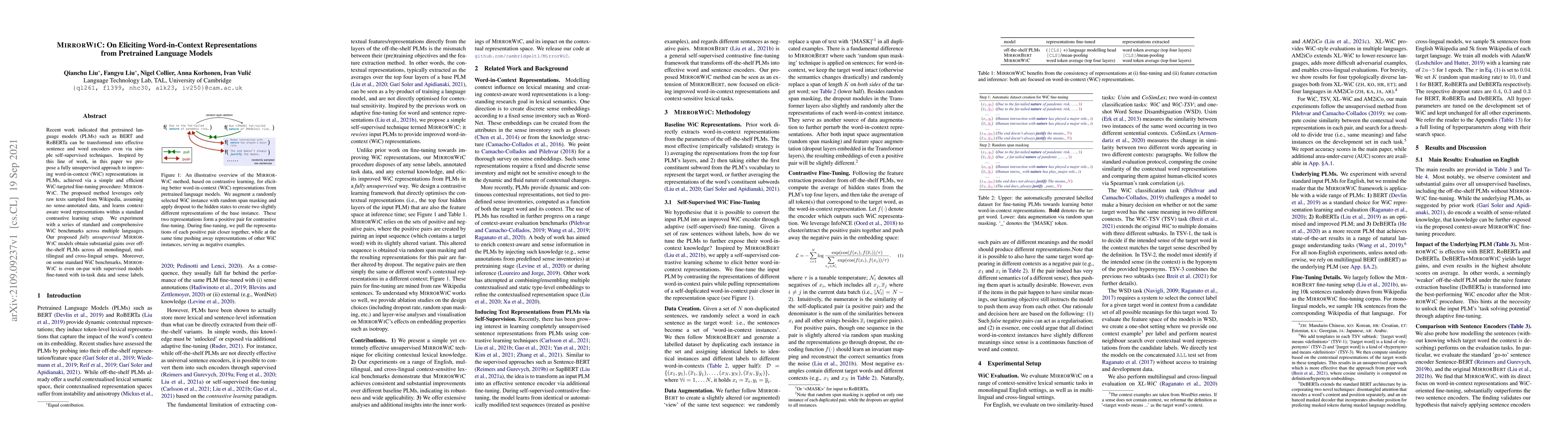 This paper proposes MirrorWiC, a fully unsupervised method to enhance word-in-context representations in pretrained language models using contrastive learning and raw Wikipedia texts. MirrorWiC achieves significant improvements over standard PLMs across various benchmarks, sometimes matching the performance of supervised fine-tuning models.