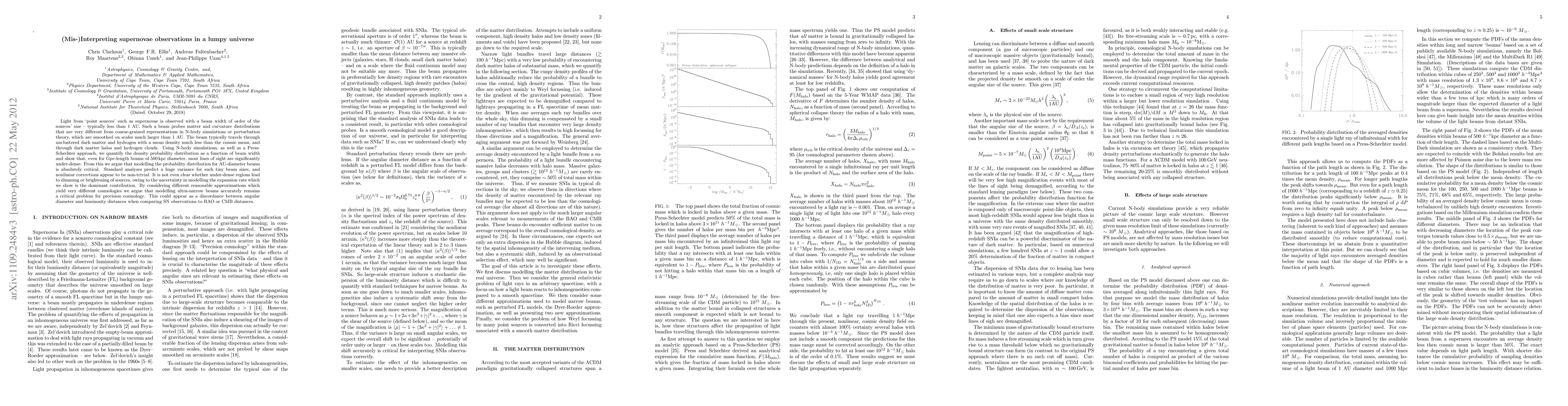 Light from `point sources' such as supernovae is observed with a beam width of order of the sources' size - typically less than 1 AU. Such a beam probes matter and curvature distributions that are very different from coarse-grained representations in N-body simulations or perturbation theory, which are smoothed on scales much larger than 1 AU. The beam typically travels through unclustered dark matter and hydrogen with a mean density much less than the cosmic mean, and through dark matter halos and hydrogen clouds. Using N-body simulations, as well as a Press-Schechter approach, we quantify the density probability distribution as a function of beam width and show that, even for Gpc-length beams of 500 kpc diameter, most lines of sight are significantly under-dense. From this we argue that modelling the probability distribution for AU-diameter beams is absolutely critical. Standard analyses predict a huge variance for such tiny beam sizes, and nonlinear corrections appear to be non-trivial. It is not even clear whether under-dense regions lead to dimming or brightening of sources, owing to the uncertainty in modelling the expansion rate which we show is the dominant contribution. By considering different reasonable approximations which yield very different cosmologies we argue that modelling ultra-narrow beams accurately remains a critical problem for precision cosmology. This could appear as a discordance between angular diameter and luminosity distances when comparing SN observations to BAO or CMB distances.