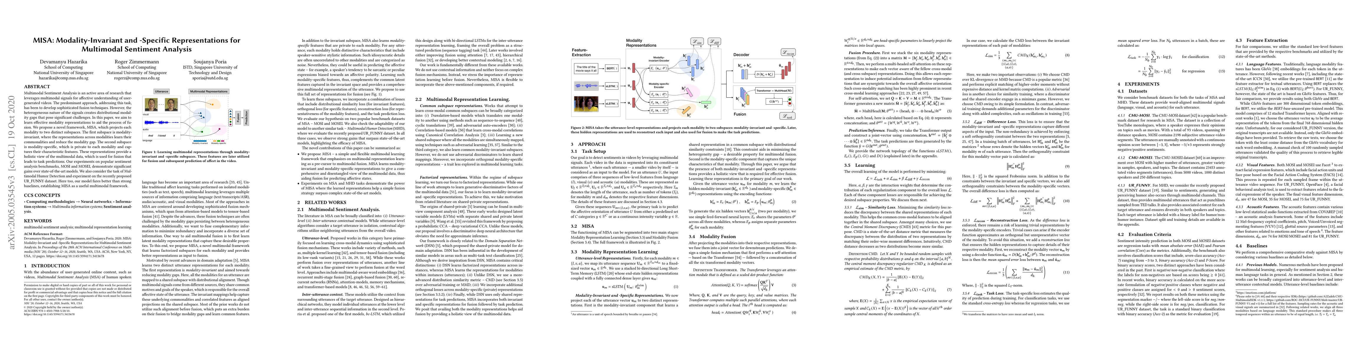 The MISA framework proposes modality-invariant and -specific representations to address distributional modality gaps in multimodal sentiment analysis, achieving significant gains over state-of-the-art models on benchmarks like MOSI and MOSEI, and also showing improved performance on the UR_FUNNY dataset for multimodal humor detection.