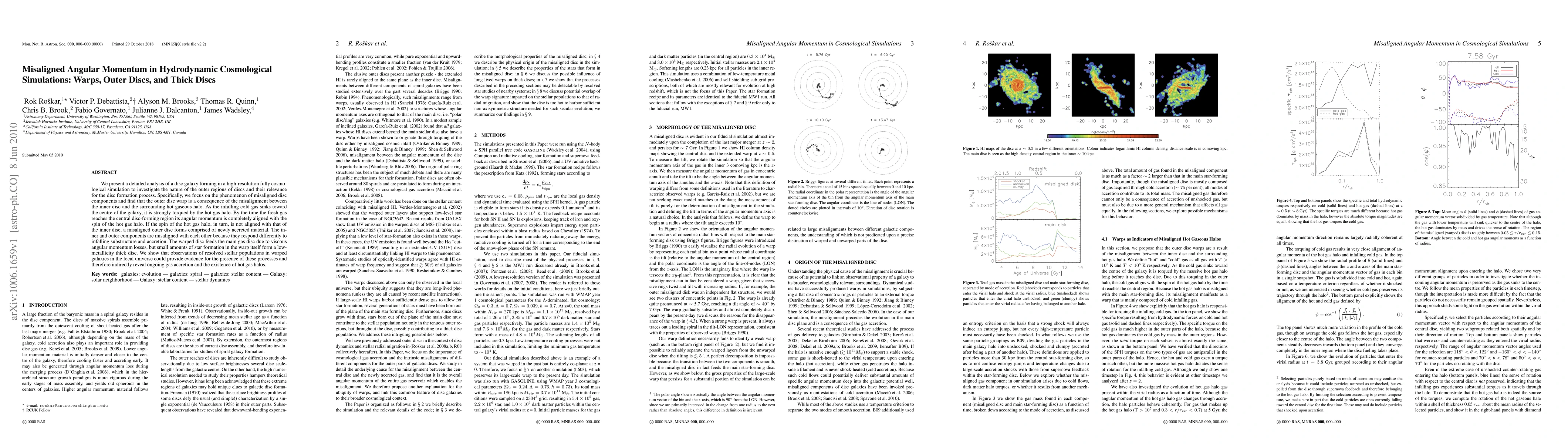 The paper presents a detailed analysis of misaligned angular momentum in hydrodynamic cosmological simulations, revealing the physical mechanisms behind warped outer discs and thick disc formation.