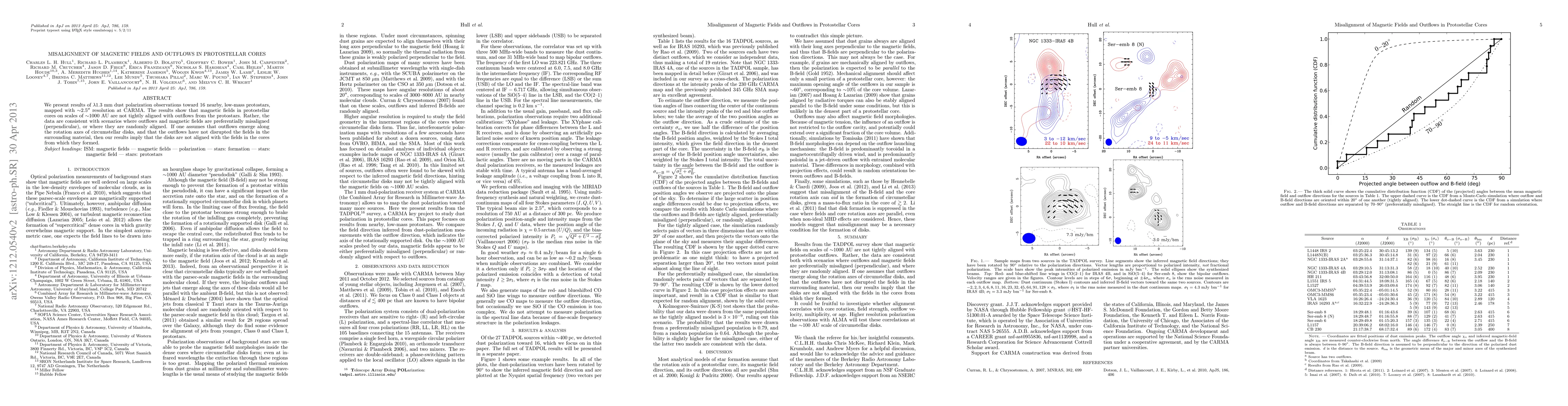 We present results of 1.3 mm dust polarization observations toward 16 nearby, low-mass protostars, mapped with ~2.5" resolution at CARMA. The results show that magnetic fields in protostellar cores on scales of ~1000 AU are not tightly aligned with outflows from the protostars. Rather, the data are consistent with scenarios where outflows and magnetic fields are preferentially misaligned (perpendicular), or where they are randomly aligned. If one assumes that outflows emerge along the rotation axes of circumstellar disks, and that the outflows have not disrupted the fields in the surrounding material, then our results imply that the disks are not aligned with the fields in the cores from which they formed.
