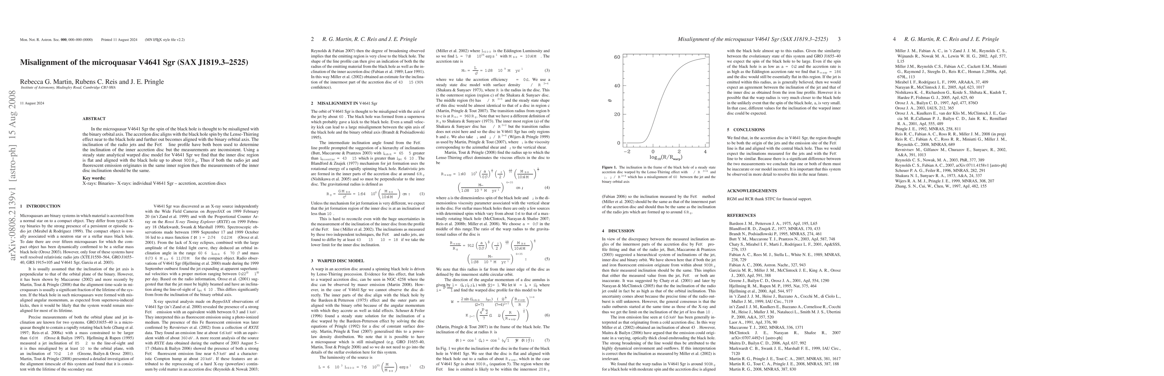 The paper presents an analytical warped disc model to study the alignment of the inner accretion disc in the microquasar V4641 Sgr, providing insights into the disc-jet misalignment problem.