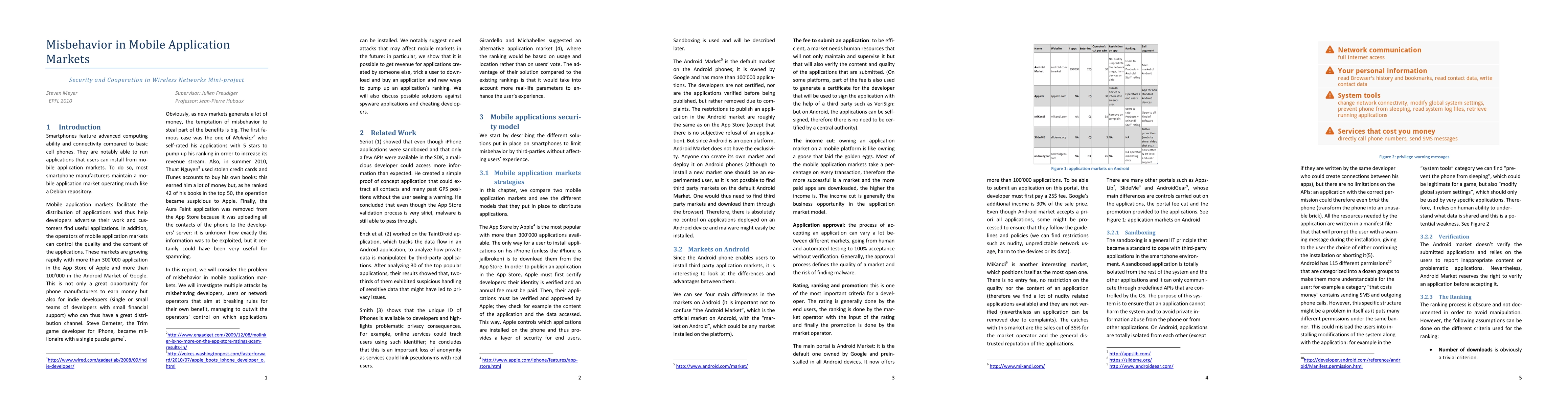 This paper explores the issue of misbehavior in mobile application markets, including attacks by developers, users, and network operators that exploit the system for personal gain. It highlights novel methods for revenue theft, user deception, and application ranking manipulation, and proposes potential countermeasures against spyware and cheating.